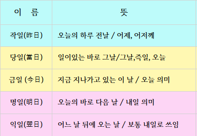 "언제 금요일까지라고 했냐?"고 했더니 많은 아이들이 금요일 자정까지라고 분명히 안내했다 하더랍니다. 이상해서 과제 제출을 한 아이들한테 물었더니 "금일 자정"이라고 말씀하셔서 자신들은 수요일에 제출했다고 답했답니다. 그제서야 많은 아이들이 제출하지 않은 이유를 알게 되었다고 하면서 일상 생활에서 쓰는 날짜 관련 어휘들을 아예 칠판에 적어 놓았답니다.