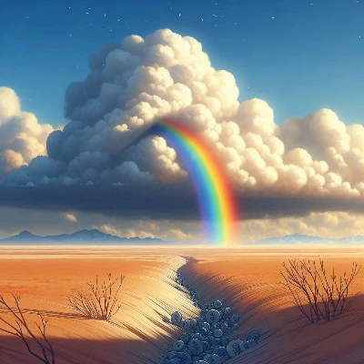 무지개를 꿈꾸는 사막은 불가능한 꿈을 꾸는 것처럼 보인다. 그 꿈은 포기하지 않는 사람만이 볼 수 있다. 사막에서 무지개를 본 사람은 이제 그 메마른 땅을 단순히 불모지로만 보지 않는다. 그는 그 안에서 변화의 가능성을 보았고, 무지개는 단순한 빛의 현상을 넘어서 메마른 현실 속에서도 희망을 찾을 수 있다는 것을 상기시킨다. 무지개는 우리에게 불가능 속에서 가능성을 찾으라는 메시지를 던진다.