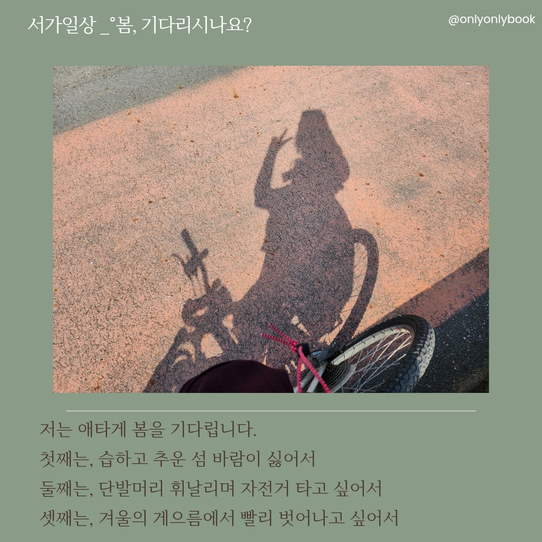 단발머리 휙휙 날리며 좋아하는 빠른 비트 음악 크게 틀어놓고 쌩쌩 바람 가르며 전진하면 자유인이 된 것 같은 속이 뻥 뚫리는 자전거 탈 날을 기다린다.