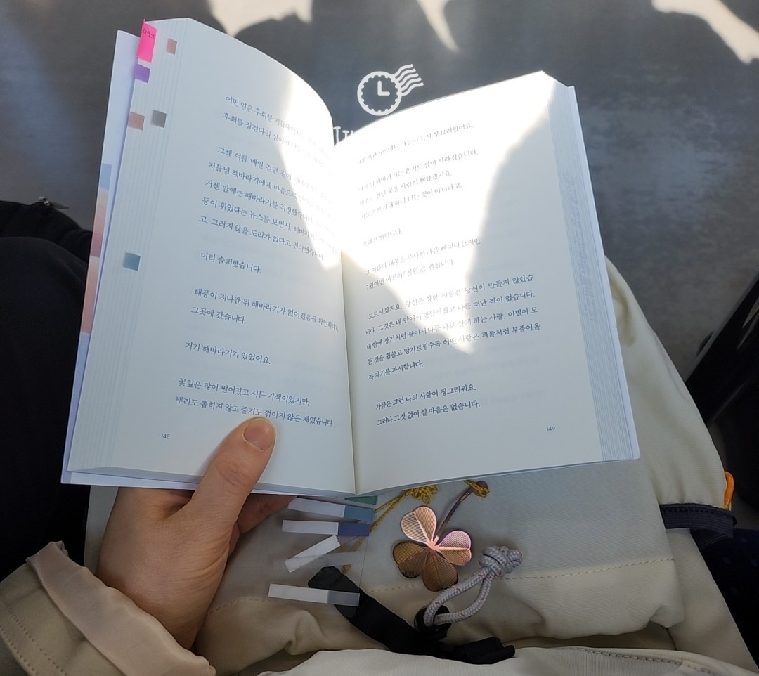 남편과 나란히 앉아 가방 속 책을 꺼냈다. 서울역까지 50여분. 틈새 아닌 제대로 독서를 즐길 수 있었다. 머리 위 내리쬐는 봄햇살 조명 삼아 24 절기 편지를 읽어갔다. 마치 지하철 안에는 발신인 그녀와 수신인 나만 존재하는 것 같았다.