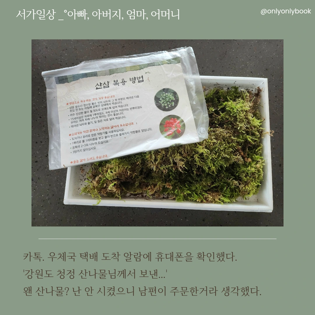 아이 셋 키우느라 돈 많이 들어간다고 쌀사서 보내주시고, 계절마다 김치에 반찬 해주시는 엄마. 날 더워지면 기력 떨어지는 건 젊은 우리 보다 아빠일 텐데 장뇌삼 보내는 아버지.
