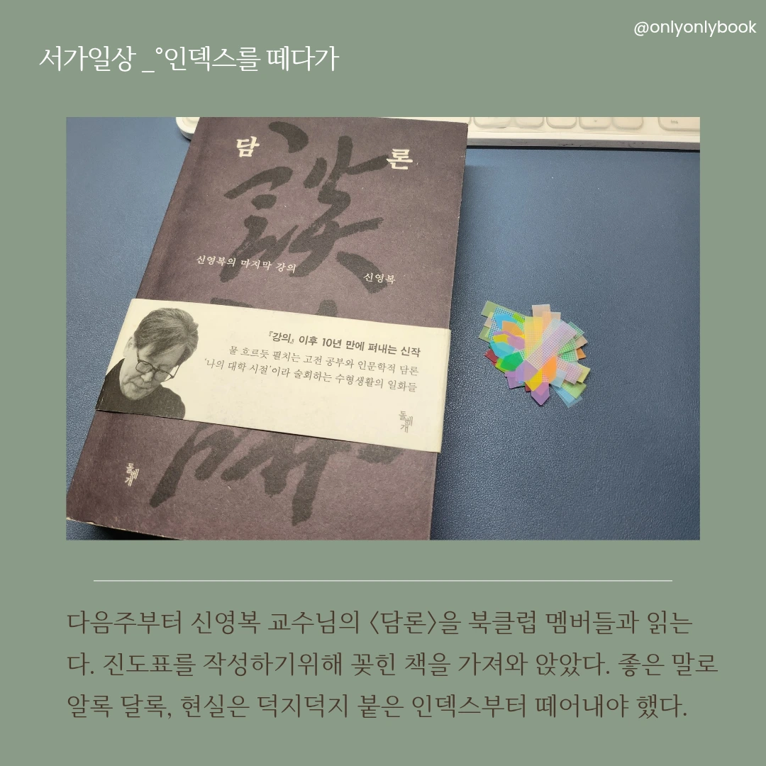 드디어 <담론>을 만날 때가 왔다. 멤버들에게 제공할 진도표를 만들기 위해 책장의 책을 가져와 책상에 앉았다. '뭘 이리 많이도 붙였담?' 덕지덕지 붙은 인덱스가 과한 나의 욕심 같은 이유는 뭘까?