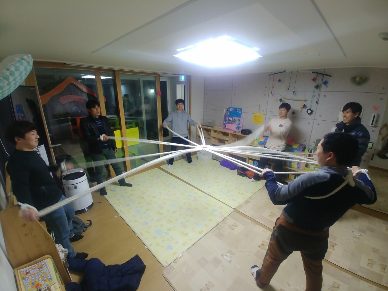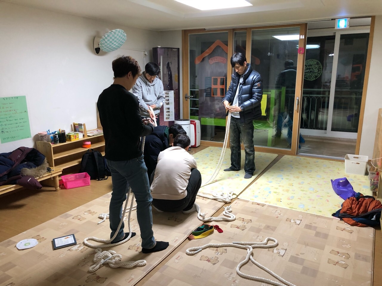 학교에서 아빠들과 모임을 몇 번 한 적이 있다. 그 땐 난 담당 교사로서 참여한 아빠 모임이었다. 여기 터전에서는 아빠 모임에 '아빠'로서 참여한다. 그 사실 하나만으로도 참 기쁘다. 그런데 아빠들 참 가정적이고 특히 아이들에게 너무 잘한다. 듣다보면 자극도 받고 아이디어도 얻는다. 어느 어린이집에가서 이런 모임에 참여할 수 있을까? 지난 해에는 비정기적으로 모이다가 1월 부터 정기 모임을 갖기로 했다. 정기 모임의 첫 미션은 '햇님밧줄' 만들기였다. 참, 이런 멋진 장면을 만날 때 참 여기 들어오길 잘 했다는 생각이 든다.