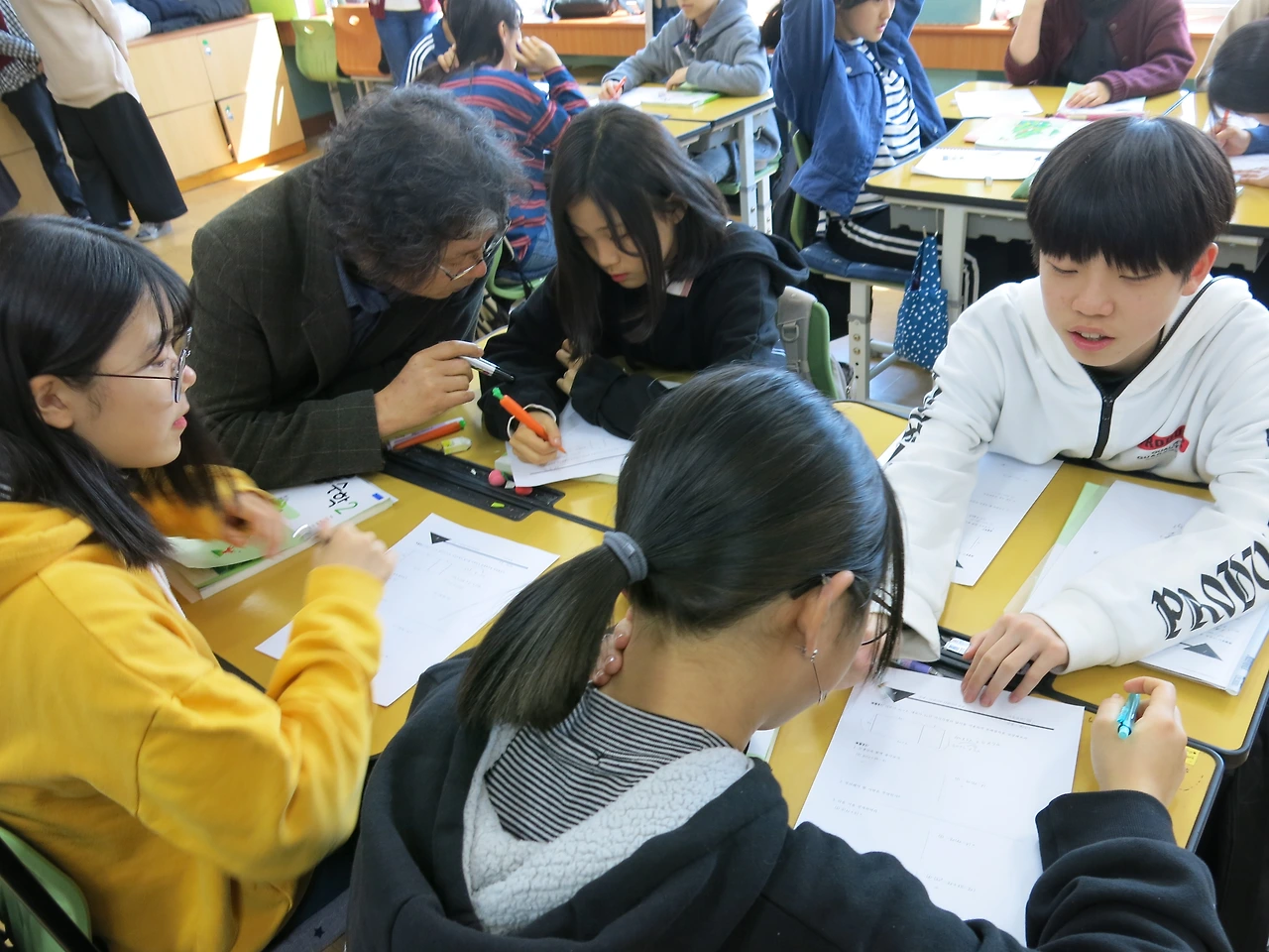 저는 배움의 공동체 수업을 진행하고 있습니다. 모둠을 구성해서 매 수업에 ‘피타고라스의 정리에 대해 설명하라’와 같은 주제 질문을 던집니다. 그리고 주제 질문과 연관된 활동지를 나눠줍니다. 그러면 아이들끼리 토의하며 원리를 찾고 문제도 풉니다. 그러다 잘 안 풀리면 전체 되돌리기도 해보고, 연결 짓기도 하면서 주제 질문을 분석하고 탐구하면서 배움을 형성해 나갑니다. 배움의 공동체 수업을 하면서 아이들과 소통하는데 아이들이 잘 따라 주고 인정해 줍니다. 수학 수업 시간을 좋아하고 기다려주니까 할만은 합니다.