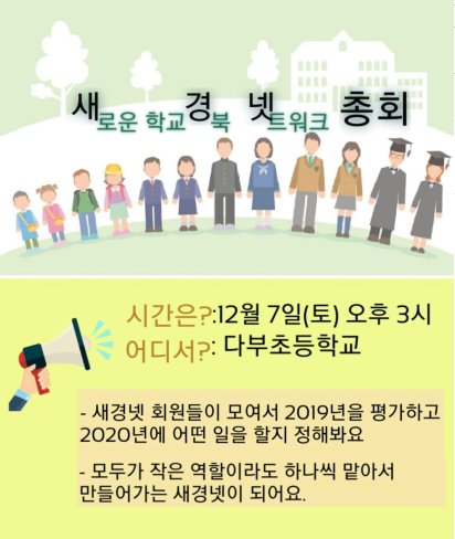 지난 12월 7일 경북새넷은 칠곡 다부초에서 총회를 열었습니다. 2019 사업 평가와 결산을 보고한 후 2020년 경북의 미래교육에 대해 방향을 논의하였습니다. 배부된 총회자료집 안에 새로운학교교육원리, 회칙, 사업평가, 결산 보고, 회원명부 등을 자세히 안내하였습니다. 특히 모두가 작은 역할을 맡아 함께하는 새경넷이 되도록 결의하였습니다. 다음은 2019 북새넷 사업평가 자료입니다.