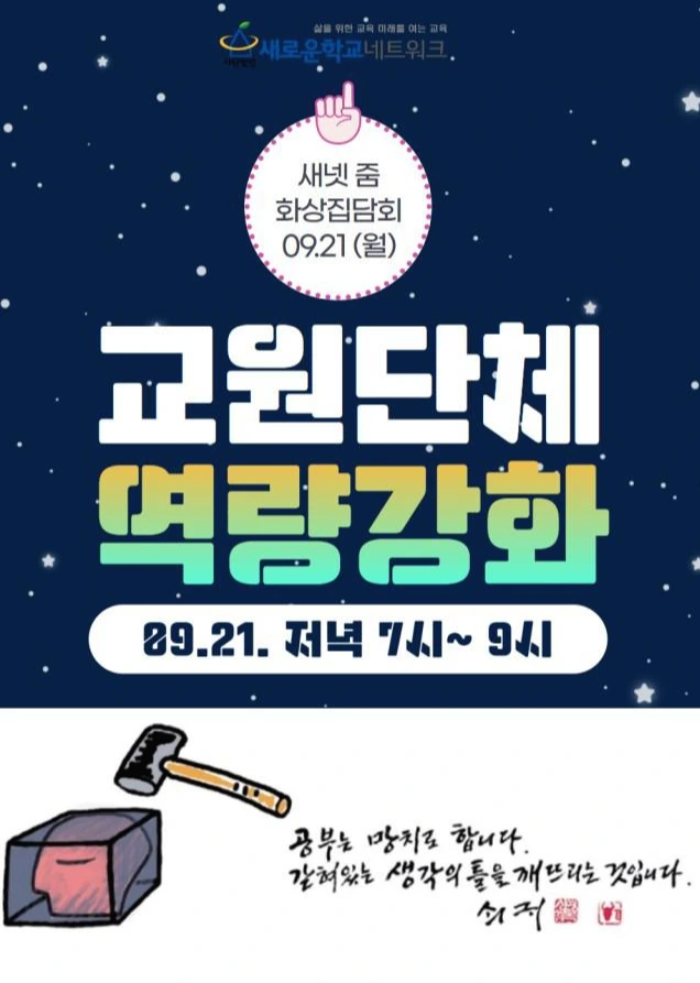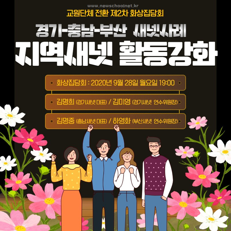 새로운 학교 지원센터는 9월 21일과 28일 두 번에 걸쳐 교원단체 전환을 주제로 화상집담회를 열었다. 새로운학교지원센터는 교원단체 전환이라는 새로운 과제를 어떻게 추진해나가야 할지 실무적인 정보 공유가 필요하다는 지역새넷의 의견을 받아 이 포럼을 기획했다. 또 조직역량을 강화할 수 있는 연수 사례와 충북, 충남, 부산 등 지역 새넷 활동을 나누며 자유로운 토론이 이루어졌다.