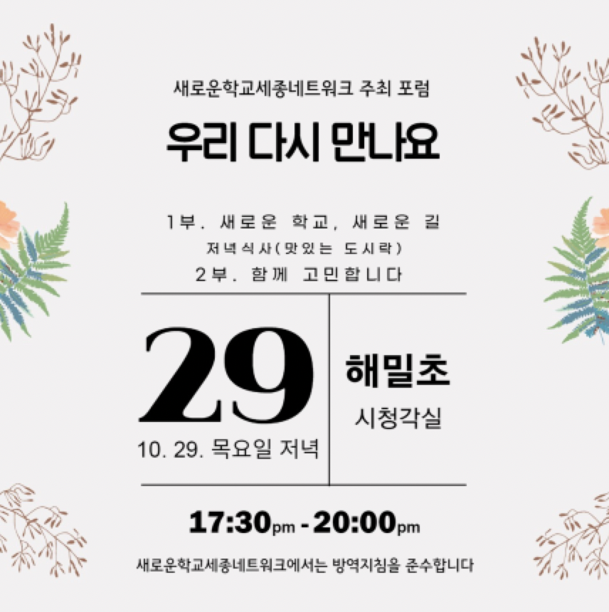 세종특별자치시의 혁신 교육을 이끌어 왔던 세종새넷이 다시 마음을 가다듬고 새로운 길을 열어가고자 합니다. 지난 10월 29일 해밀초에서 “새로운학교, 새로운 길”을 주제로 만남을 가졌습니다. 준비모임부터 당일 나눔까지 오랜 시간 그날의 향기가 남았다고 참가하신 선생님들이 전해주었습니다.