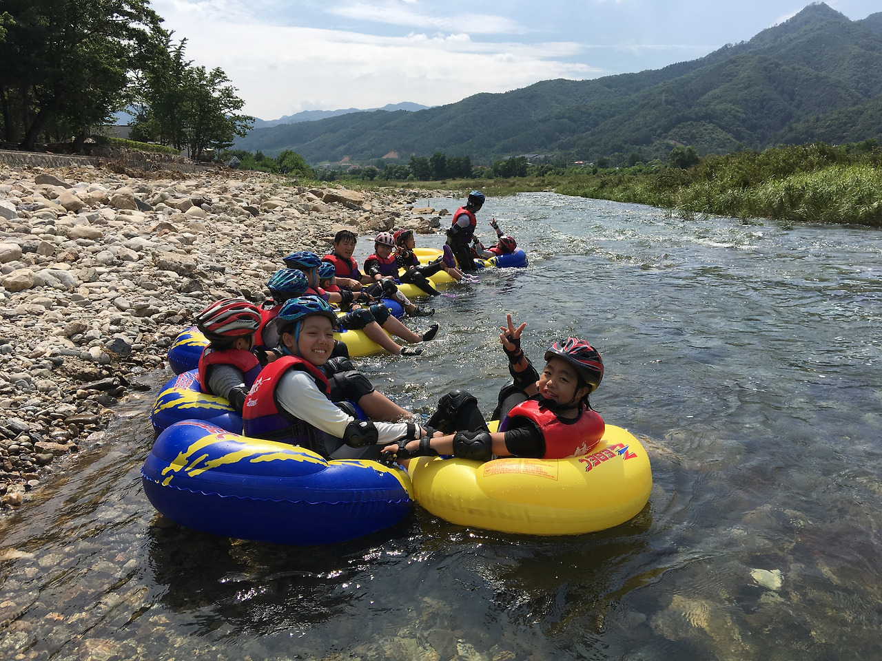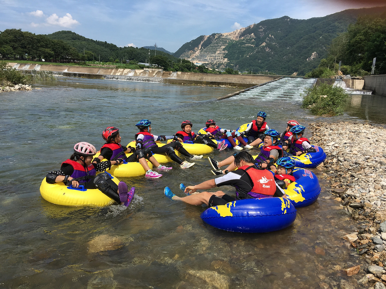 학교 앞 보의 잔잔한 곳에서 튜브에 오르고 내리고 앉고 엎드리는 등 다양한 자세를 취해본다. 흐르는 물에서 10여 미터를 떠내려가 보는 연습을 수차례 반복한다. 돌이 나타나면 발로 밀고, 손으로 밀고, 헬멧 쓴 머리로도 부딪혀 본다. 물살이 심하게 넘실거리는 곳은 친구들의 튜브를 연결하여 전복을 예방하거나 튜브 위에서 몸을 대자로 펴 통과한다. 이런 식으로 튜빙의 감각을 익힌 후, 넘실거리는 물살에 몸을 한번이라도 맡겨본 아이들은 이 즐겁고 모험적인 놀이에 빠져들 수밖에 없다.