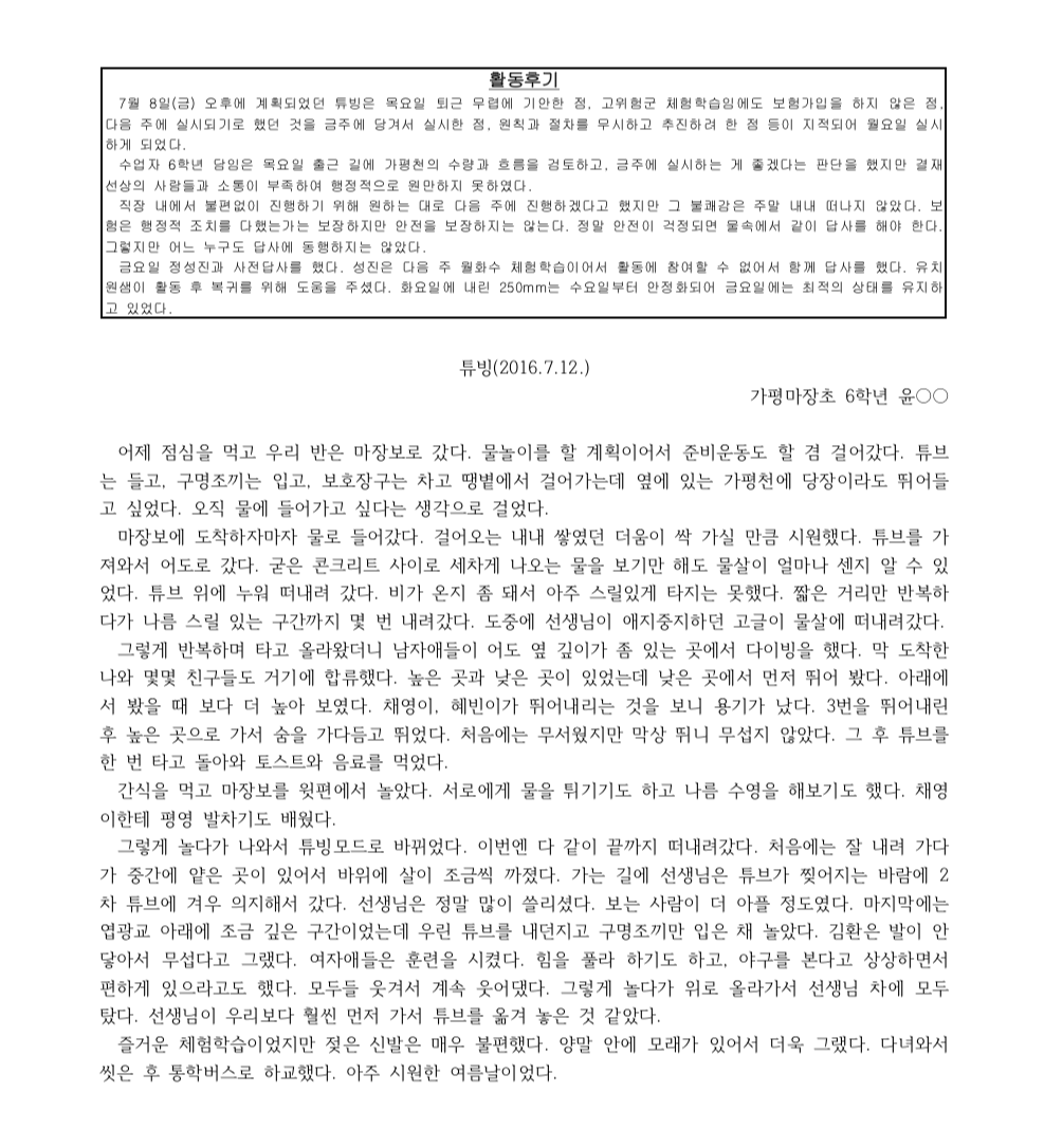 다양한 체험학습을 했지만 튜빙만큼 아이들의 만족도가 높았던 활동은 없었다. 튜빙은 그 자체로 신나고 모험적인 여름철 물놀이 활동이면서 체육과 교육과정 목표나 물놀이 안전교육의 내용들을 모두 포괄하고 있어서 더할 나위 없이 좋은 교육활동이라고 생각한다. 딸아이의 애원과 나의 독특한 사고방식에서 방아쇠는 당겨졌지만 결과적으로는 지역의 자연환경을 활용한 교육과정 재구성의 사례가 되고 말았다. 역시 삶은 우발성인가 보다.
