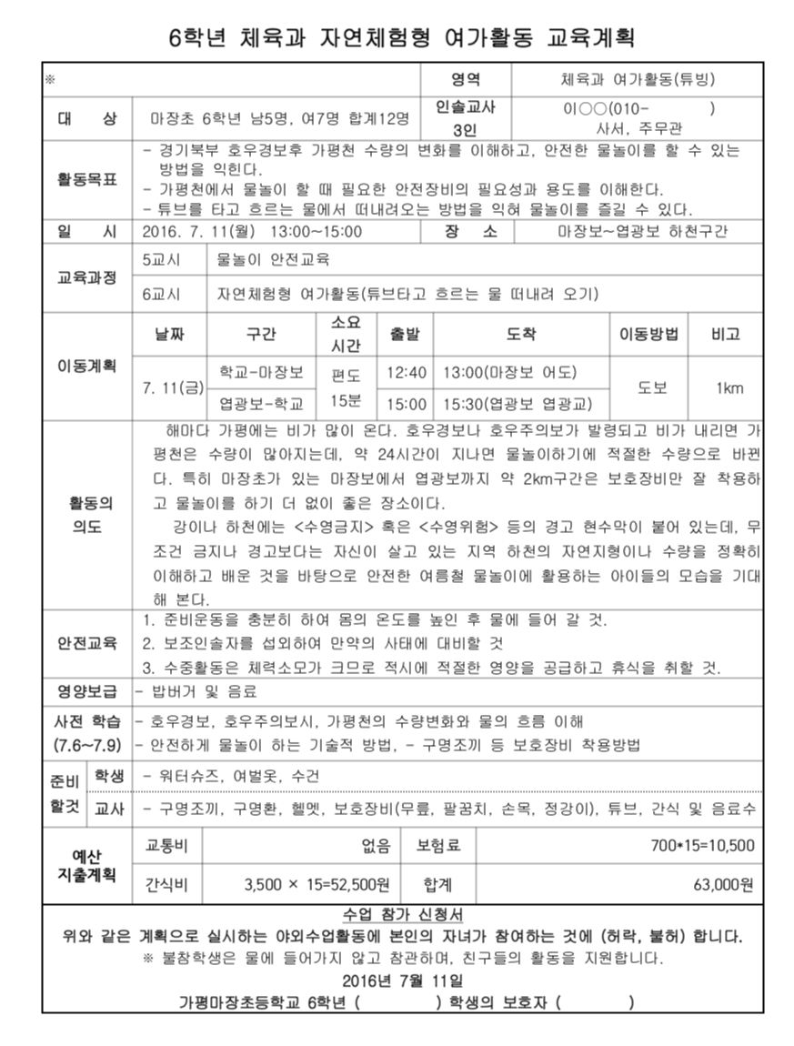 물리적 공간과 활동 주제에 대한 장악이 끝나면 막연한 두려움은 사라진다. 하천이나 강에서 발생하는 문제들은 예측 가능한 범주 안에서 일어날 것이고 그것들은 플랜A, 플랜B로 제어 가능한 것들이다. 교육과정 재구성을 통해 구상한 활동을 합법적인 교육활동으로 만들어야 한다. 2009개정 교육과정의 초등학교 6학년 체육과 여가활동에는 ‘자연형 여가활동의 창의적 계획 및 체험’을 주제로 하고 있고, 등산, 래프팅, 스키, 자전거 하이킹, 캠핑 등을 예시하고 있다.