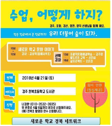 경북을 크게 3개 권역으로 나누어 경주권 4월, 상주권 9월, 영주권 11월에 민주적 학교문화와 포괄적 문제 해결 학습, 발도르프 교육, 삶 프로젝트 등의 3개 분과로 나누어 연수를 진행하기로 하였다. 지난 4월에는 경주 천북초에서 연수를 개최하였는바 약 25명의 선생님들이 참여하였다.