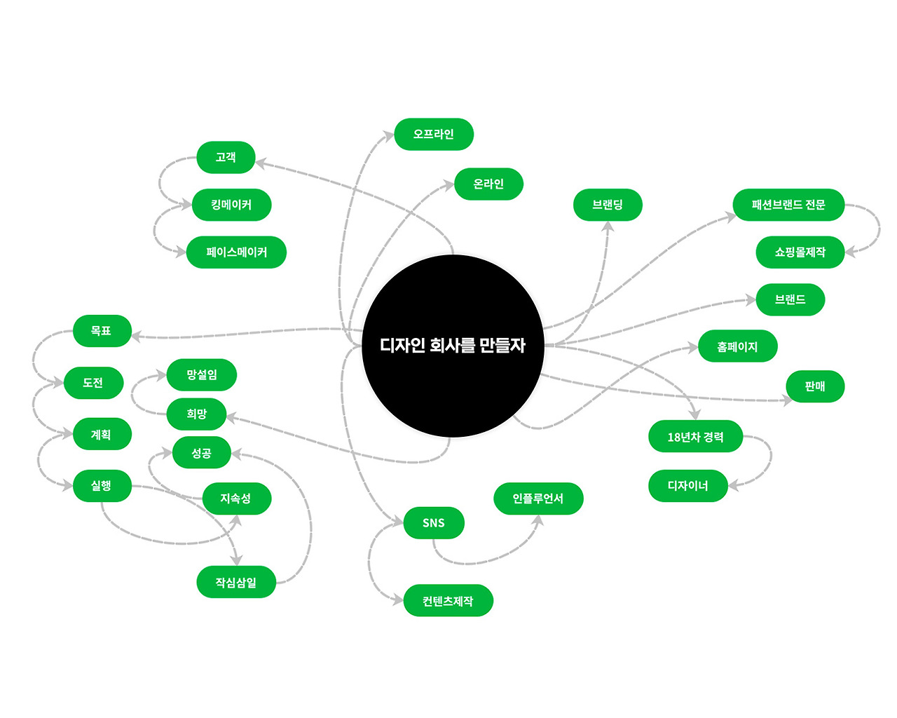 팀원들이 여러 가지의 의견을 내고 그 의견을 취합하여 공통의 목표로 나아가는데 큰 도움이 되는 작업이기 때문에, 브랜딩에 있어서 마인드맵 작업은 방향성을 정하는데 가장 중요한 작업이다. 그리고 가장 오래 걸리는 작업이기도 하다.