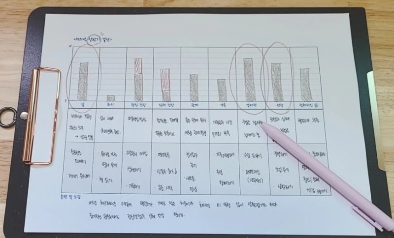 3. 마음을 지키는 일 또한 기록을 해왔다. 힘들고 우울할 때 나는 행복하고 즐거운 기억들은 희미해지고 힘들고 우울한 날들만 기억에 남았다. 내가 기록해왔던 것들을 돌아 보며 감사하고 다행인 일들을 적은 일기장을 보기도 하고 행복하고 즐거운 기억들도 찾아본다. 또 마음을 지키기 위해 책에서 배웠던 감정 그래프를 그려보기도 하고, 나의 긍정성을 향상해주는 습관을 체크해보면서 나를 돌보았다.