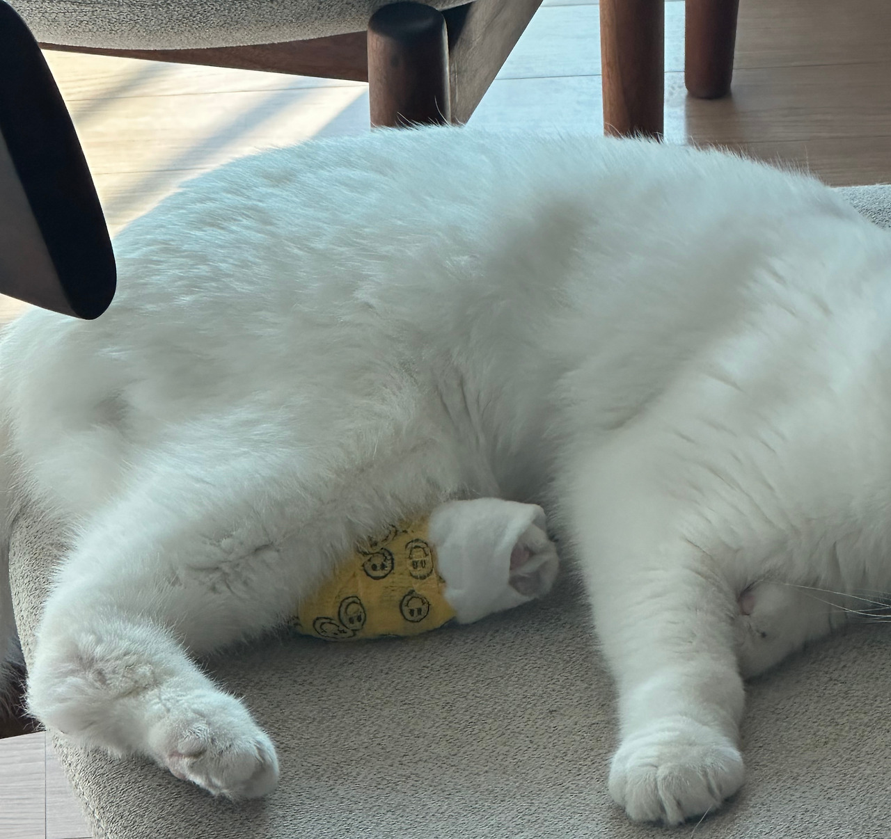 아주 살짝 찢어진 것임에도 골치가 아픈 이유는 스스로 핥아서 딱지를 떼버리고(더러운 게 묻은 줄 아나보다..) 아물기를 기다리지 못한다는 점이다.