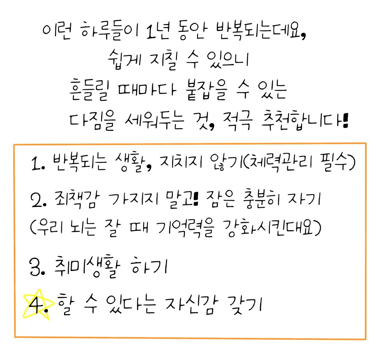 그럴 때마다 자신을 잡아줄 수 있는 단단한 다짐, 마음이 꼭 필요한 것 같습니다.