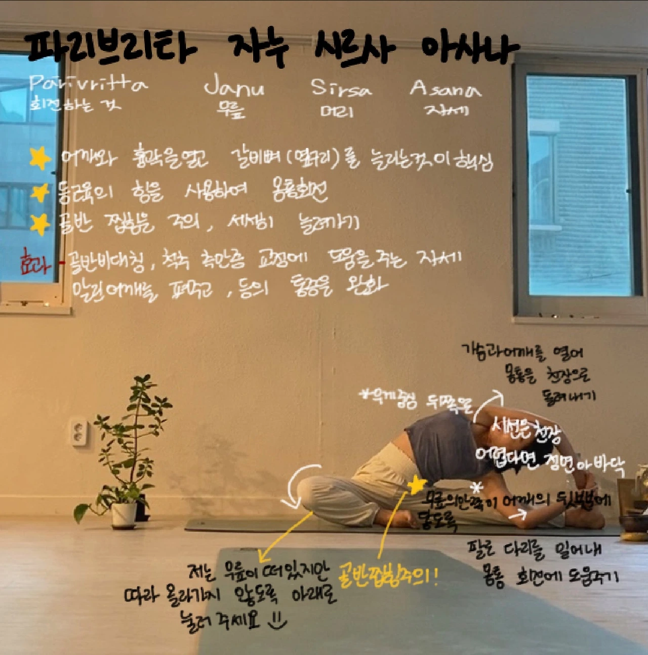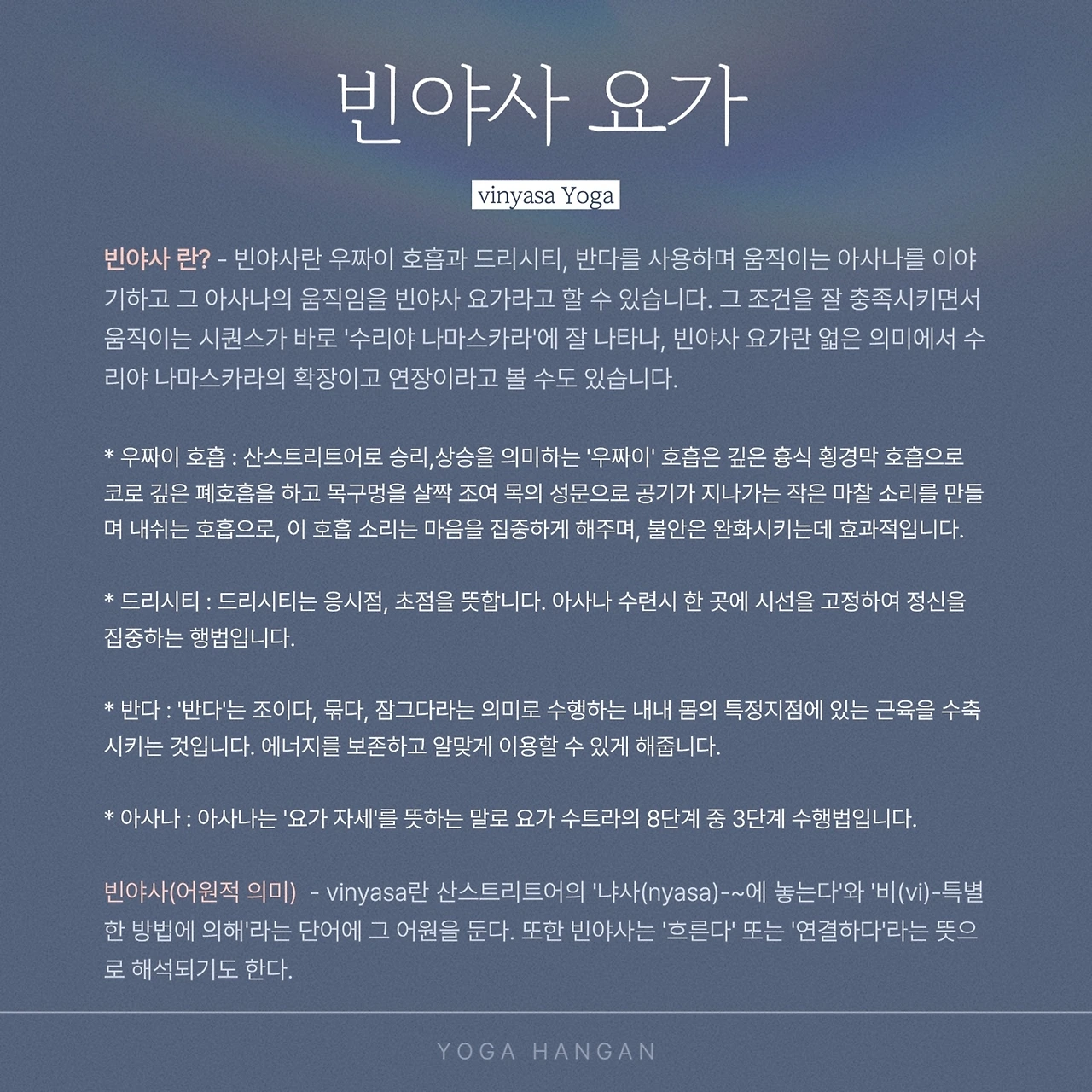 빈야사란? 빈야사란 우짜이 호흡과 드리시티, 반다를 사용하여 움직이는 아사나를 이야기하고 아사나의 움직임을 빈야사 요가라고 할 수 있다.