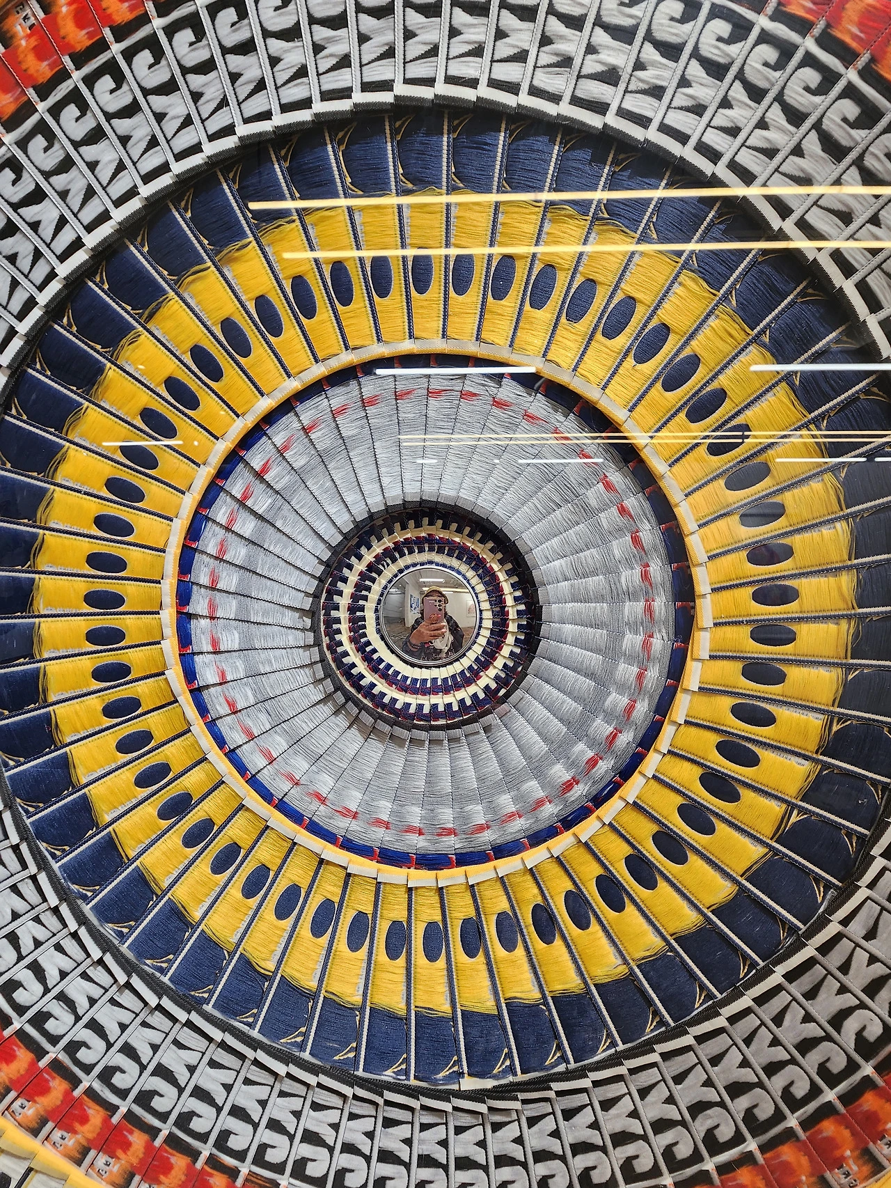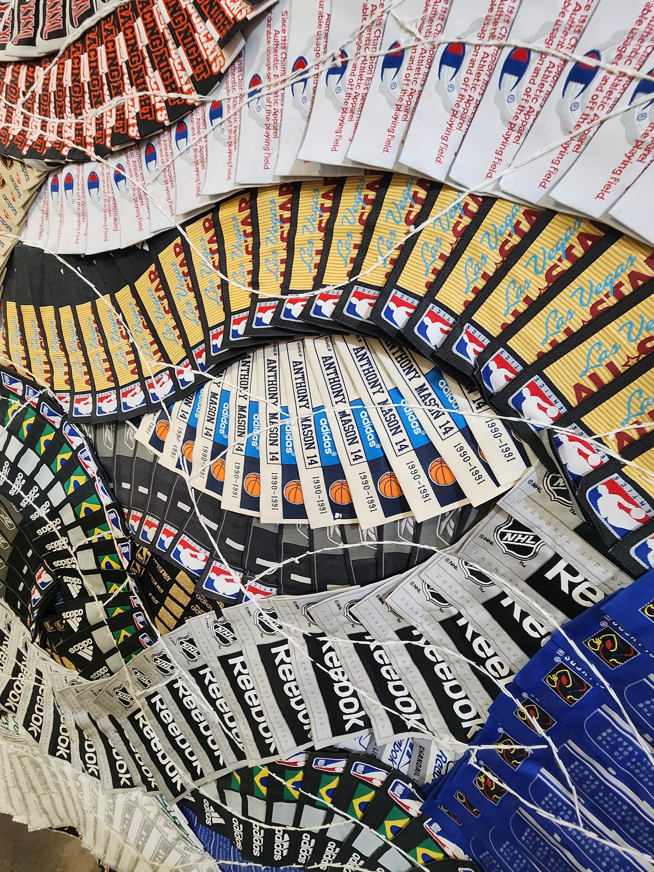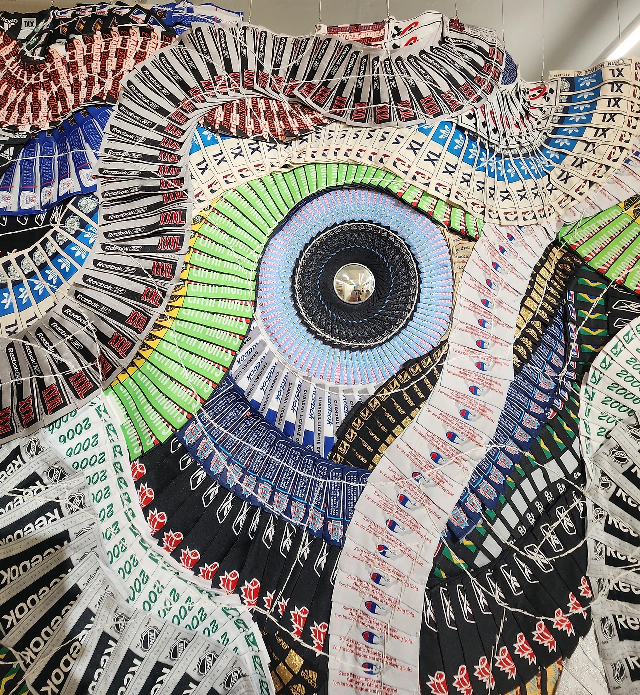 멀리에서 바라보면 꽤 근사한 작품이지만 가까이 다가서면 온갖 종류의 라벨 상표를 덕지덕지 붙여놓은 모양새이다. 눈에 많이 띄는 상표가 아디다스, 리복 같은 스포츠용품들이다.