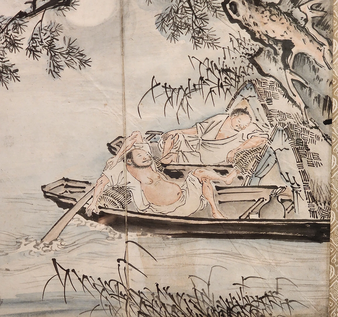수염 무성한 어부는 아직 흥이 남은 듯 팔 젖혀 노를 베고 무릎을 꼬고 달밤을 혼자서 즐기려고 하고 있다.