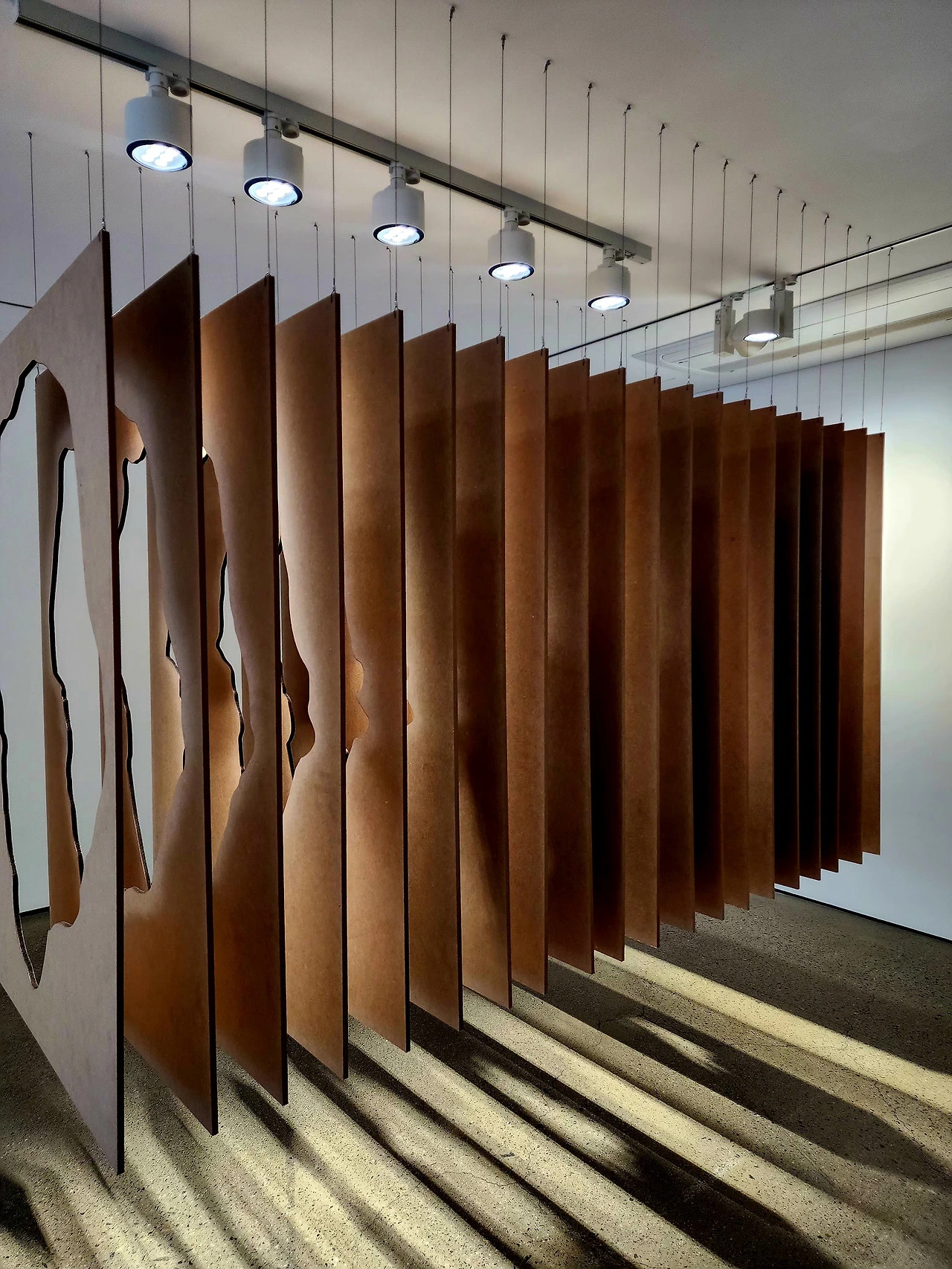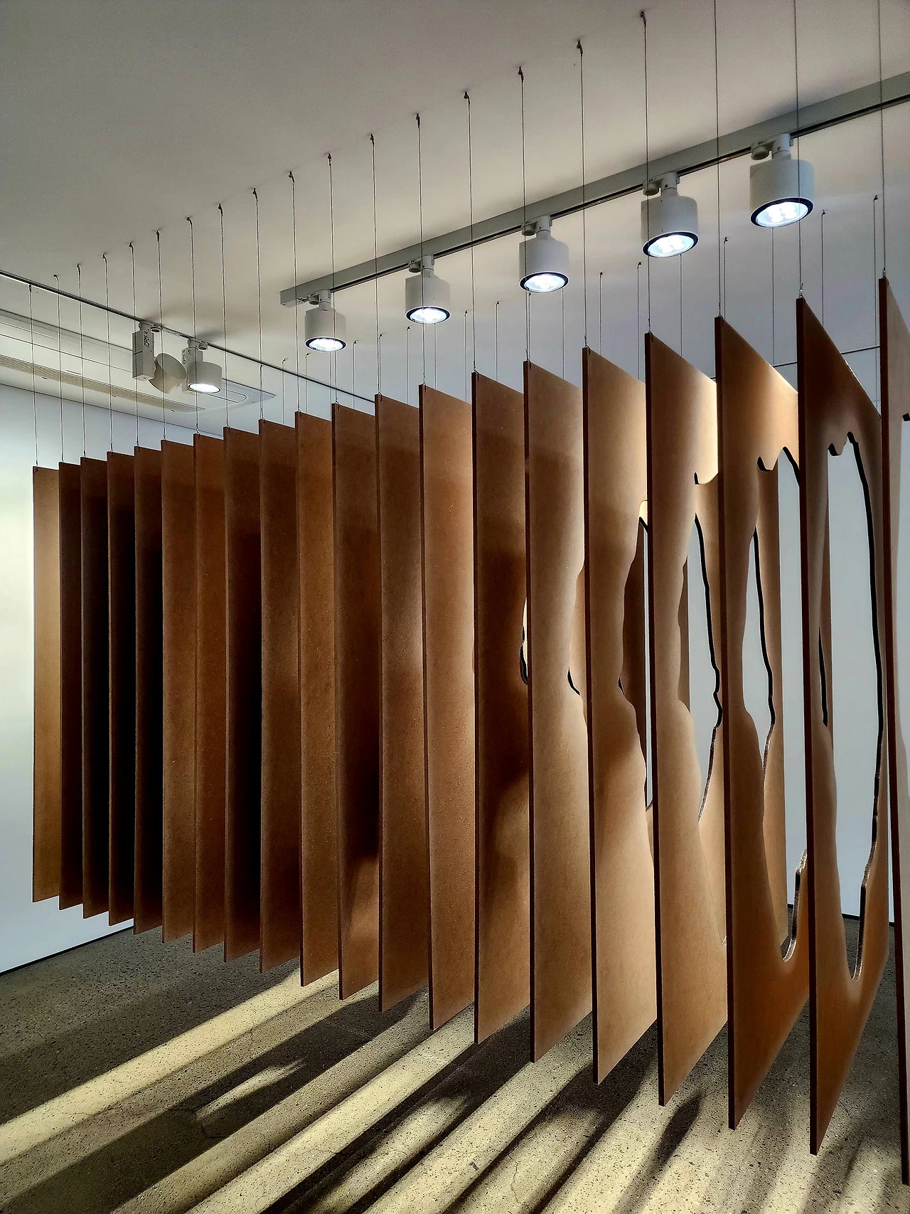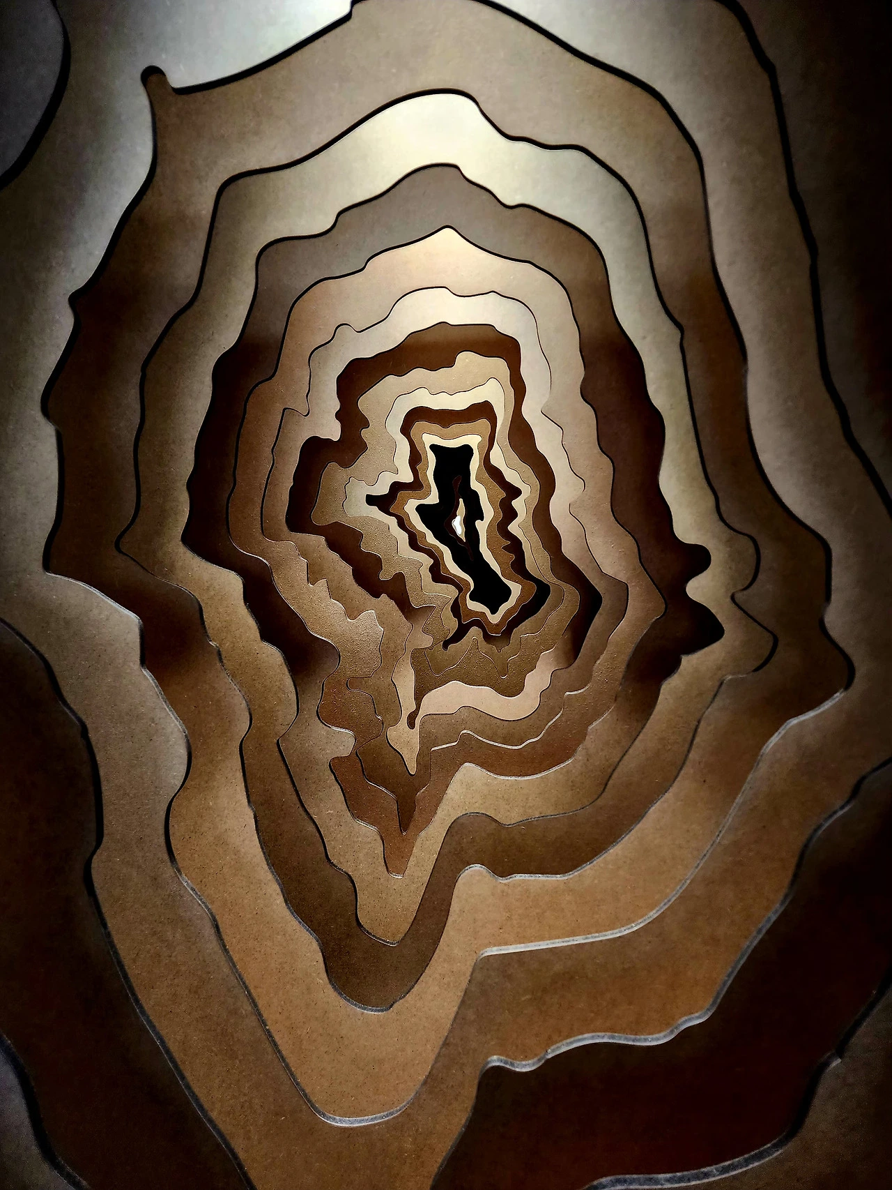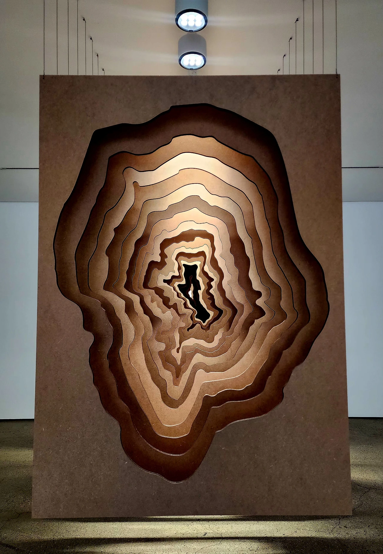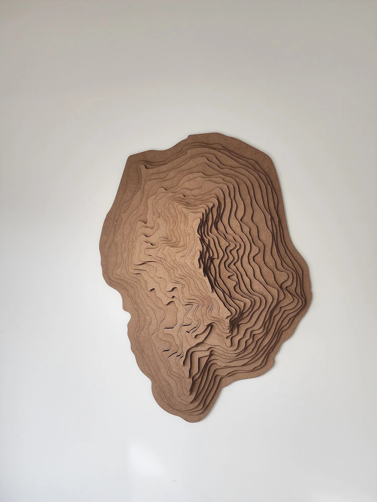 나무판 20개의 레이어로 재구성했다. 20개의 나무판에 산의 층위별 윤곽선을 그려 커팅한 후 이들을 하나로 붙였다. 작업을 감상하는 위치, 시간에 따라 다르게 보이는 전시경험을 통해 우리가 주로 획일적으로 이해하던 '산의 등고선'에 대해 다른 상상의 가능성을
