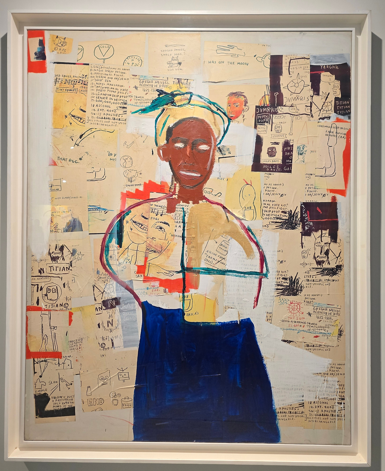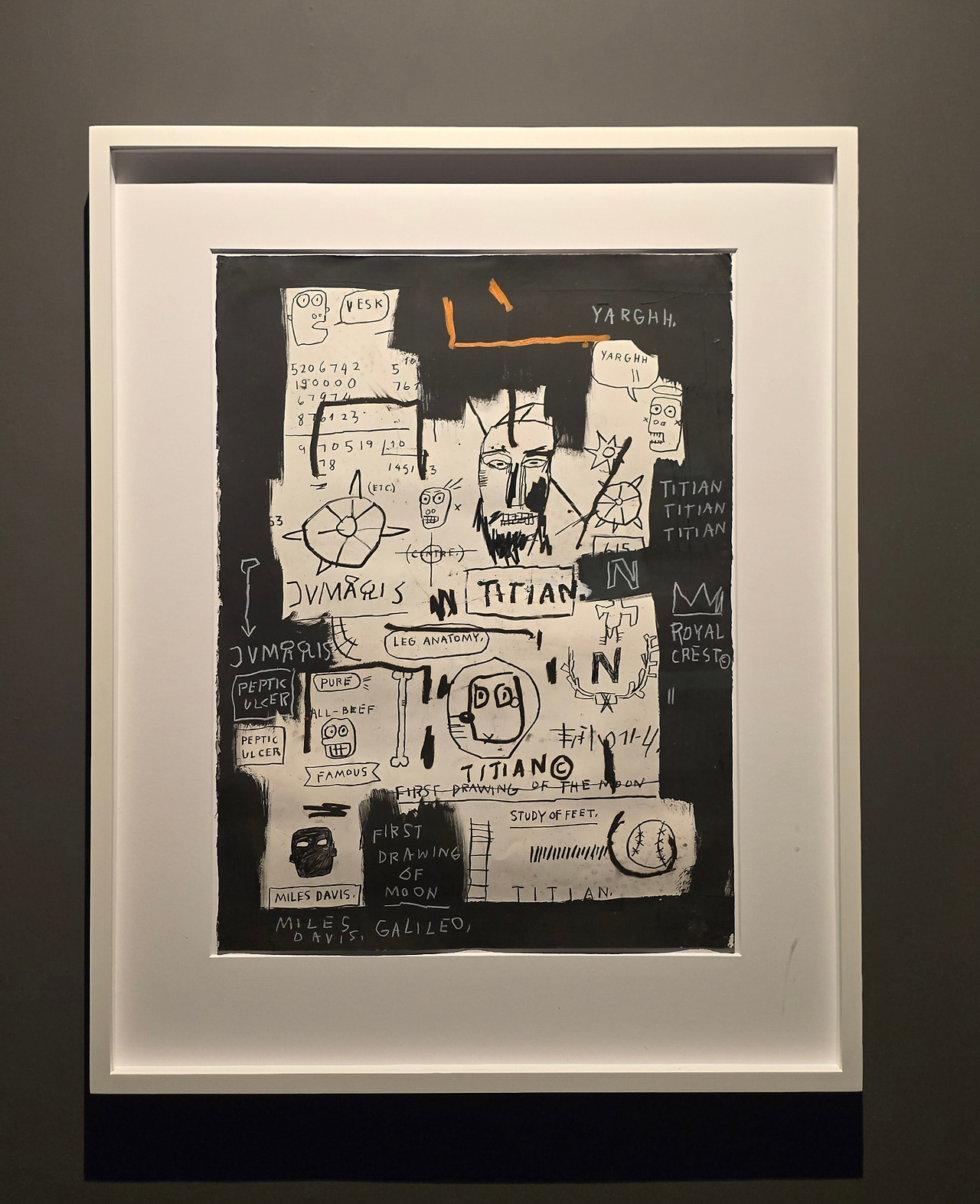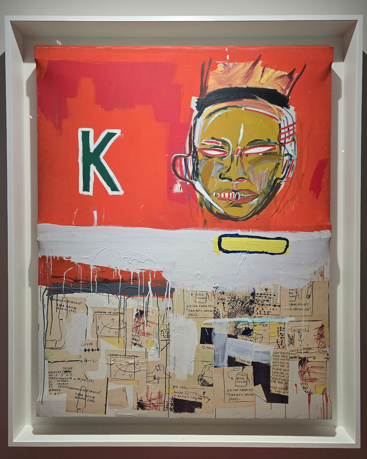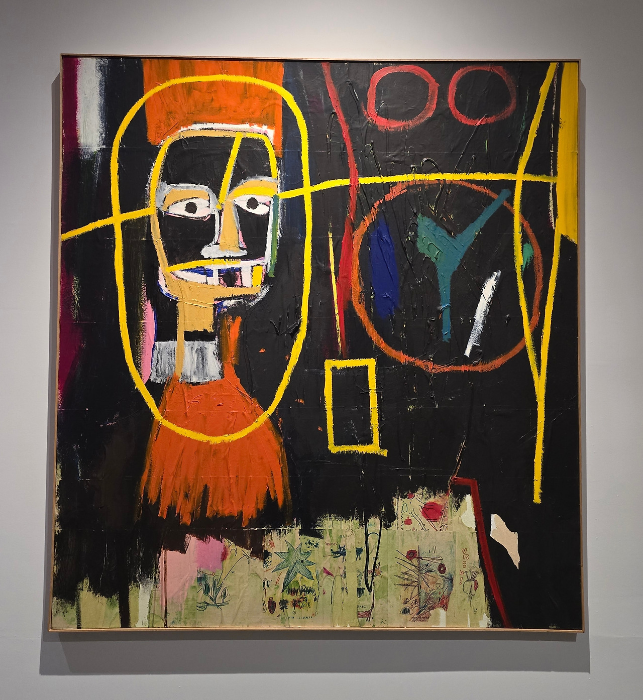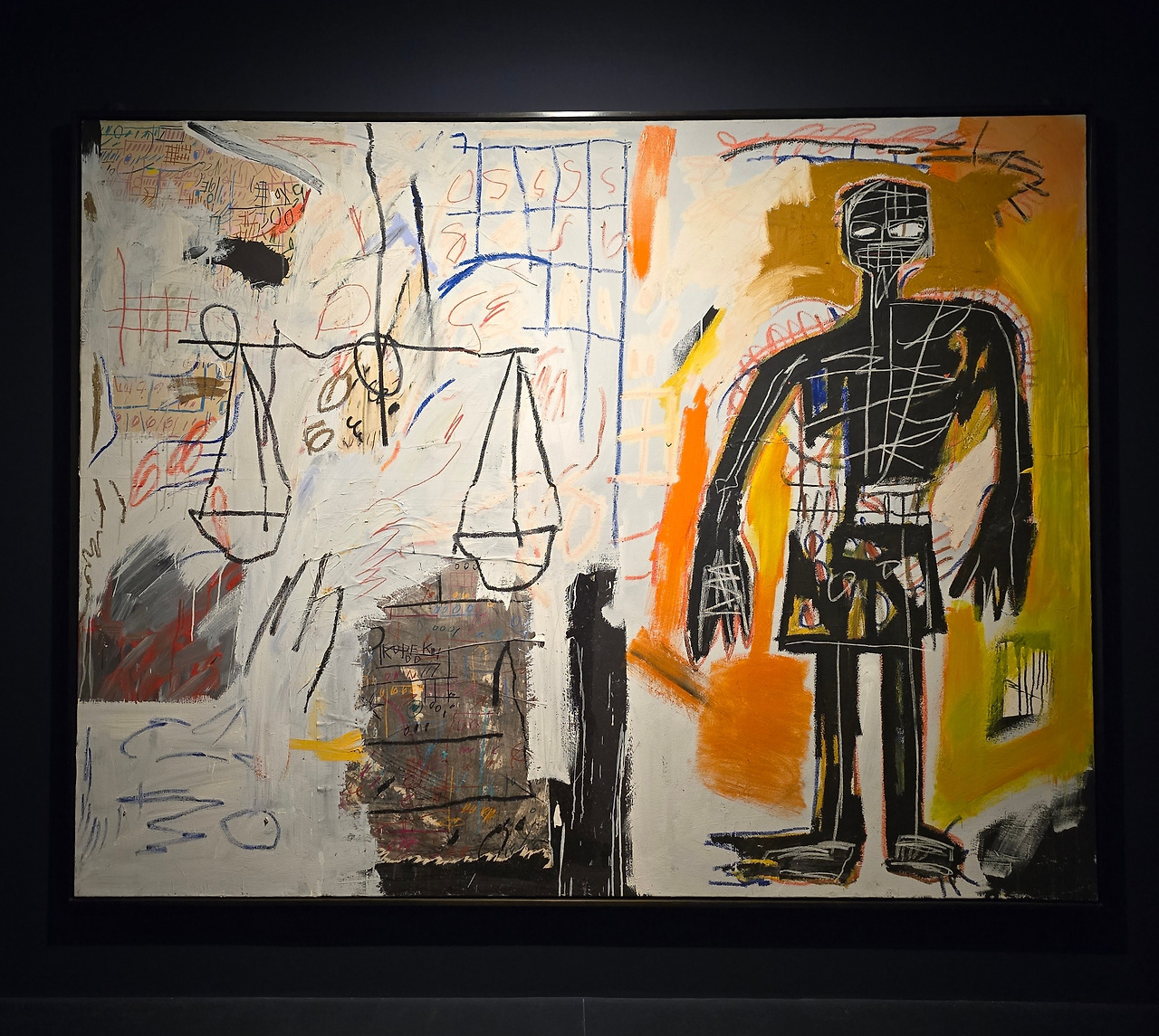 그림 속 메시지는 분명하다. 해골과 가면 형상들은 아프리카계 미국인의 정체성, 인종차별, 불평등의 서사를 풀어낸다. 바스키아는 과감한 색채와 표현적인 붓질로 사회 속 자기표현, 소외들의 복잡성을 탐구하며,