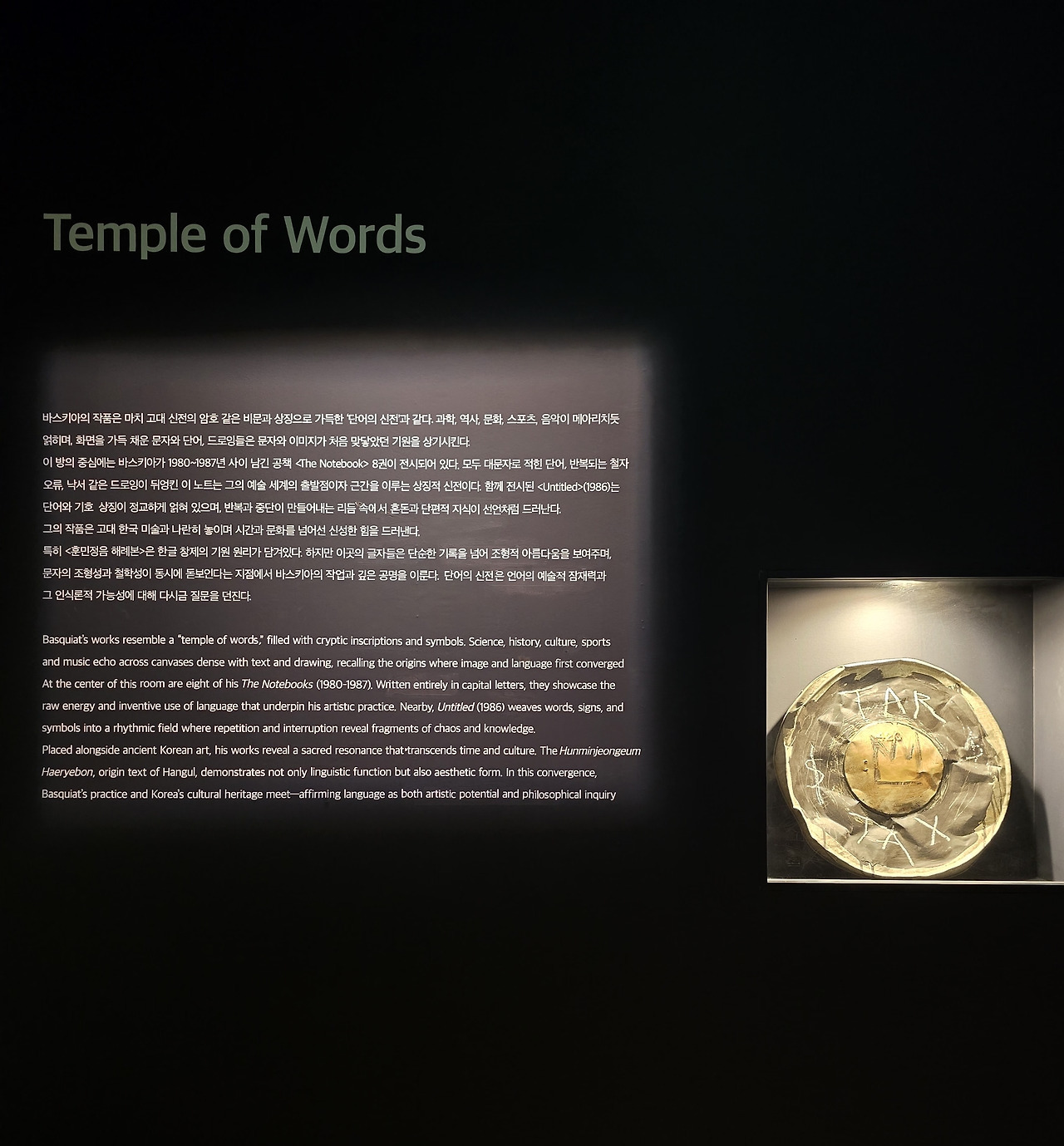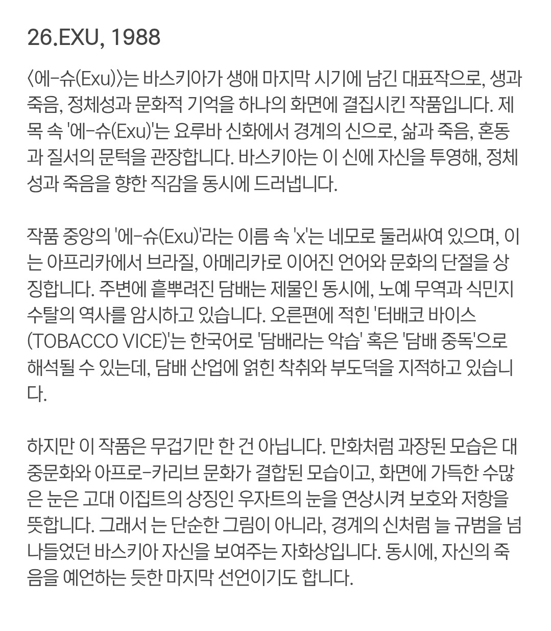 큐레이터 클라우스 커티스가 "그의 창작의 시작에는 단어가 있었다"라고 언급했듯, 바스키아는 단어의 의미뿐 아니라