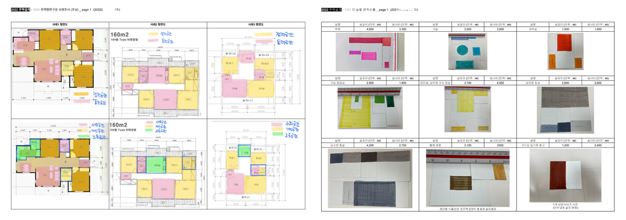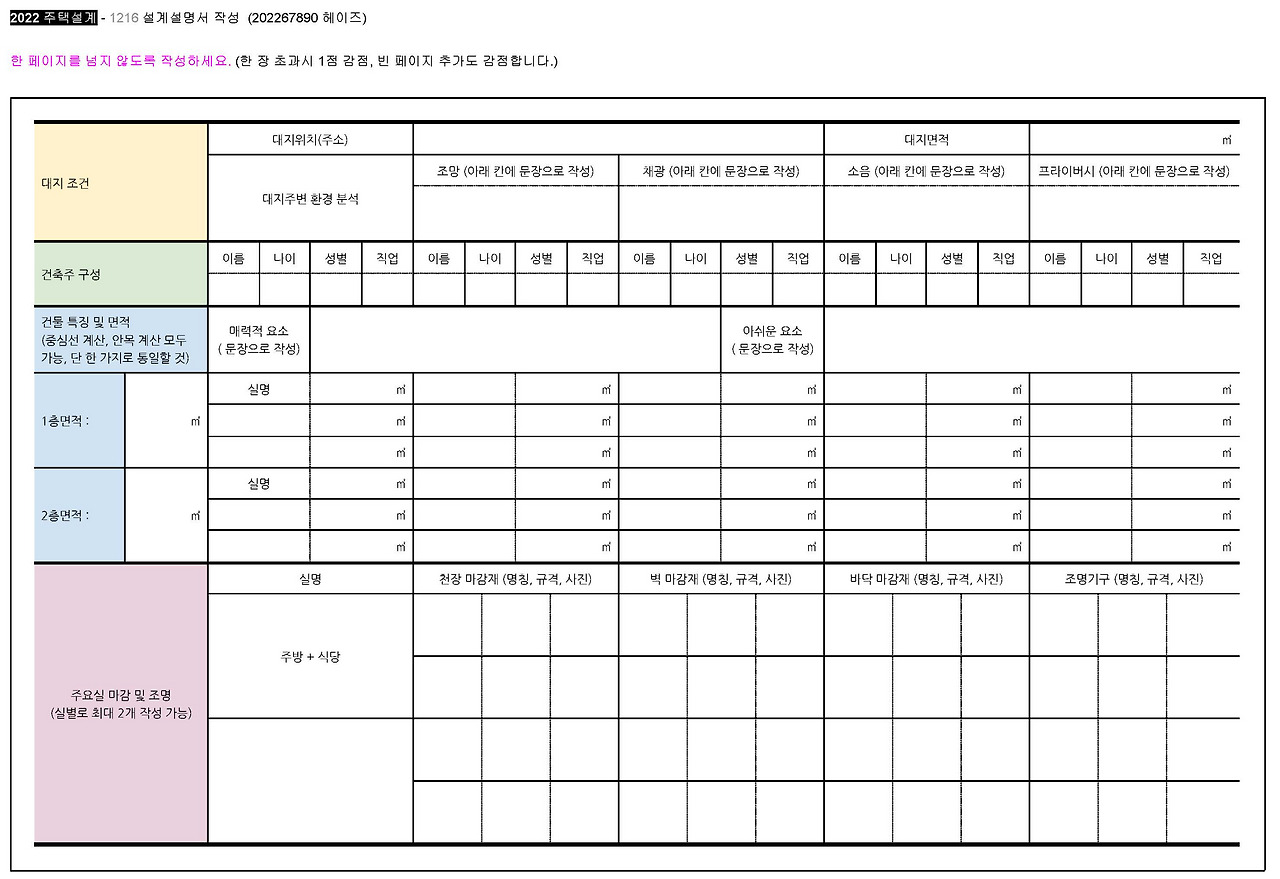 아래는 용지의 크기와 방향, 머리말을 일관되게 만든 주택설계 수업의 과제 템플릿을 나열한 것이다.