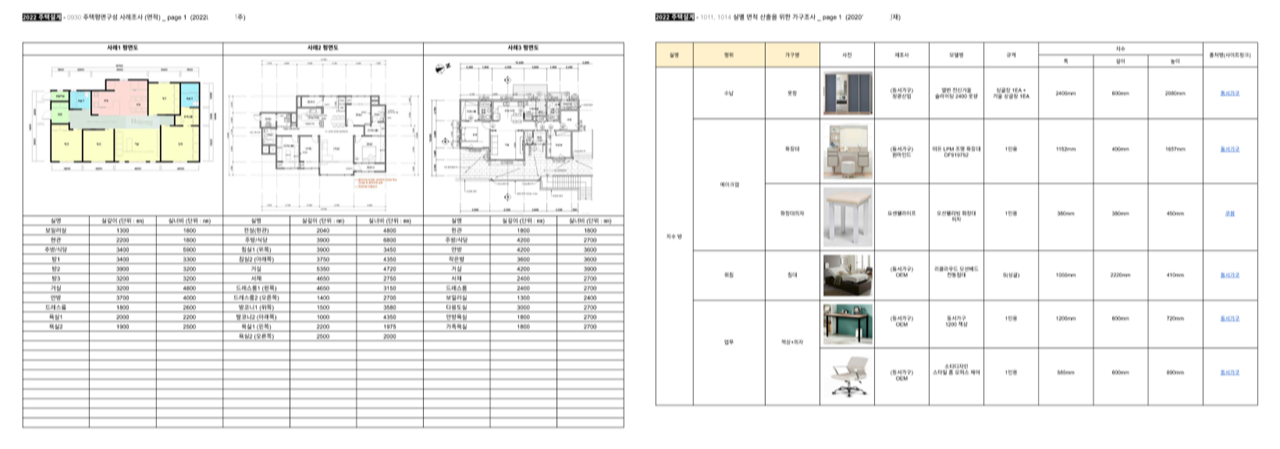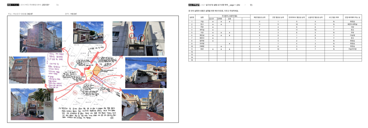 아래는 주택설계 과목에서 실제 사용한 템플릿이다. 학생들이 한 페이지 안에 각자 설계한 내용의 핵심 내용을 명확하게 정리하도록 구성한 것이다. 환경 분석, 사용자 정의, 면적 산정, 설계 아이디어, 마감재 선정 등의 항목을 순서대로 제시하여, 학생들이 논리적 흐름에 따라 누락 없이 설계 개요를 작성하도록 하였다. 이 템플릿을 통해 주택설계의 결과물에는 어떤 항목들이 포함되어야 하는지, 각 항목은 어떤 식으로 표현되어야 하는지를 파악할 수 있으리라 기대하고 만들었다.