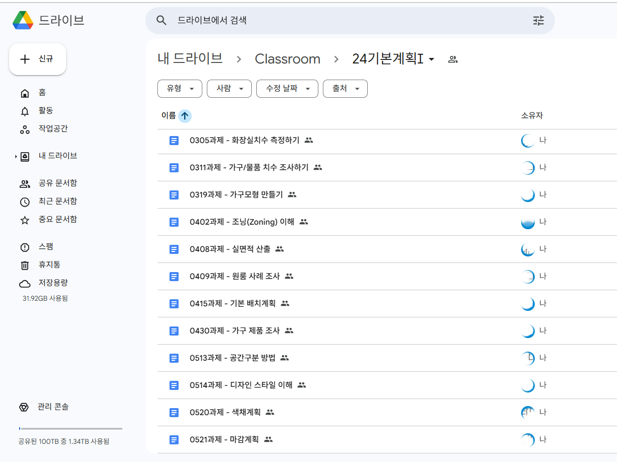물론 잘 디자인 된 한 권의 포트폴리오가 자동으로 생성되는 것은 아니다. 아래 예시는 교수자 드라이브의 모습이지만 학생들의 드라이브도 거의 동일한 모습을 하고 있다. 위에서 예시로 든 수행과제가 학생 각자의 구글드라이브에 축적되는 것이다.