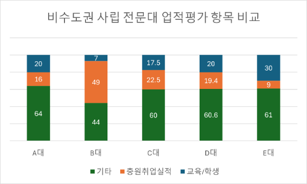 아래 차트는 비수도권 5개 전문대학의 업적평가 규정을 비교한 것이다. 크게 교육 및 학생생활지도 항목(파랑색), 충원율 및 취업률 등 실적 지표 관련 항목(주황색), 산학협력 및 봉사활동 관련 항목(초록색) 등 3개 영역으로 비교했다. E대학을 제외하고는 교수의 본업인 교육 영역의 비중이 20%에 미치지 못했다. 이 수치도 학생 생활지도를 포함한 것이다. 특히 B대학은 7%에 불과했다.