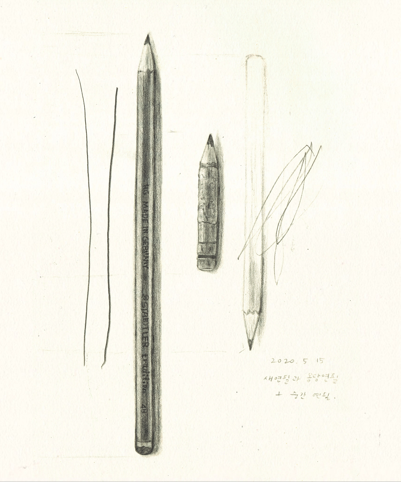 편하지 않은 밤을 보냈고, 새벽에 눈이 떠져 그림을 그린다. 몽당연필로 새 연필을, 새 연필로 몽당연필을 그린다. 한참을 집중하다 옆을 보니 어느새 아이가 깨어 나를 보고 있다. 그리고 있던 연필을 내려놓았다.