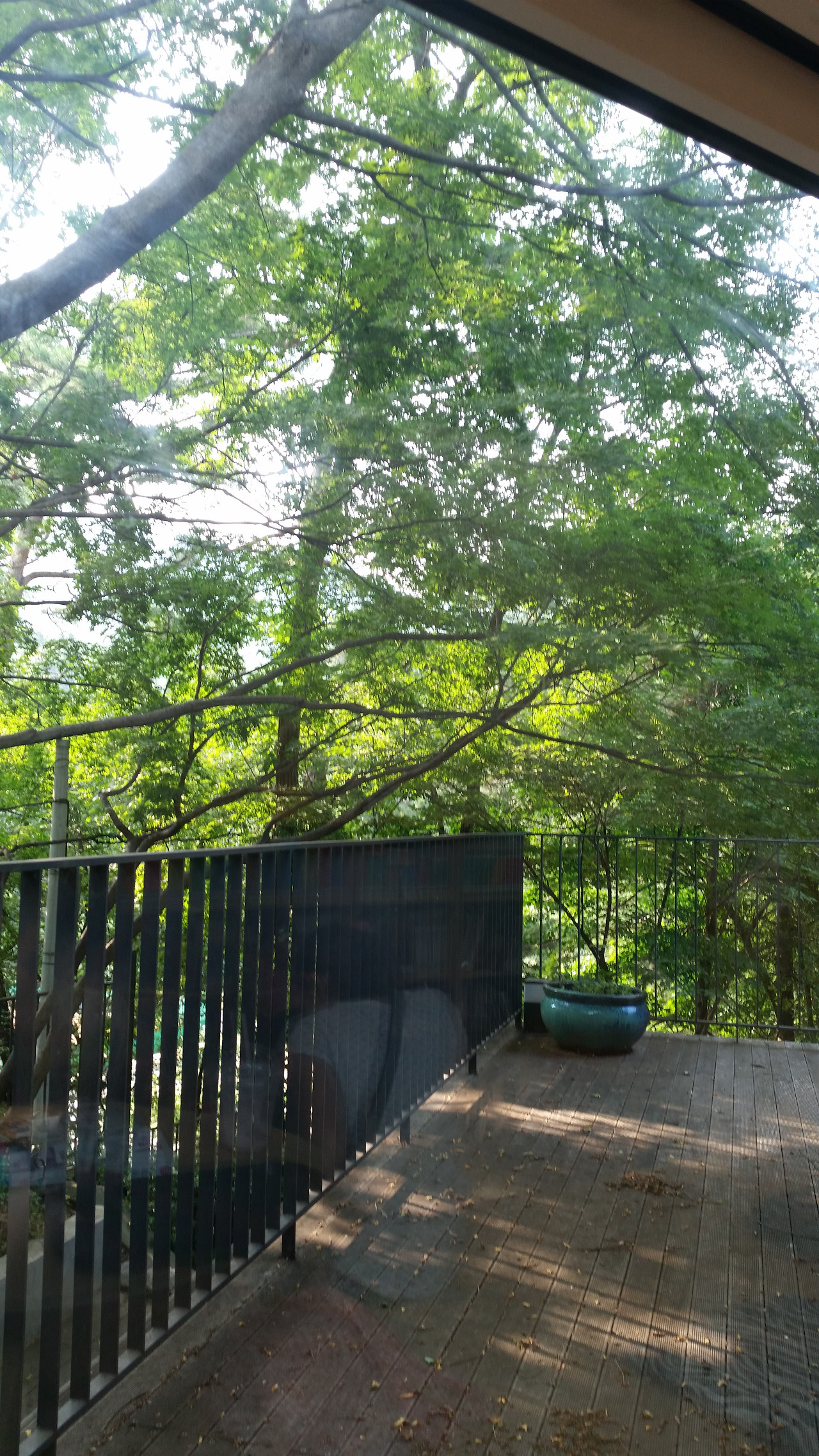 숲 속 같은 마당에. 앞에는 아이가 뛰 놀 놀이터가 있고. 나무는 푸르고. 공기는 상쾌하며.