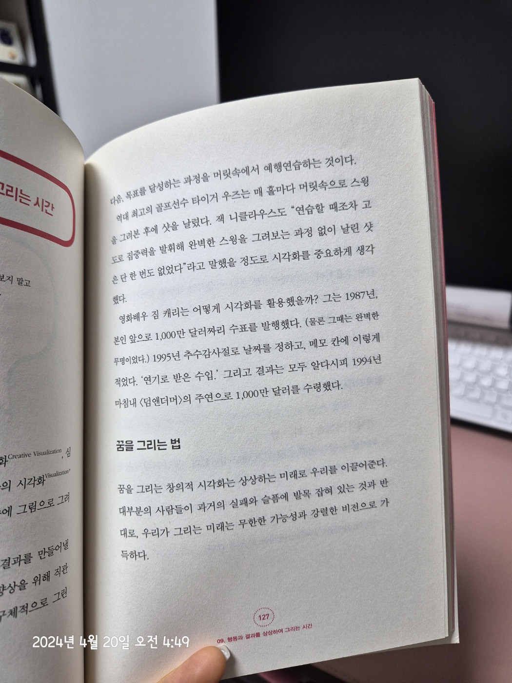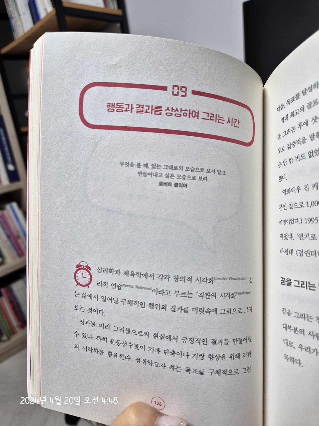 원하는 그림을 완성했다면 그 그림과 내가 일치하는 삶을 그려본다. 이러한 꿈의 시각화를 통해 긍정적이고 낙관적인 태도를 만들어낼 수 있다. 성공하는 삶을 살기 위해 매일 해야 한 행동들, 예를 들어 운동, 공부, 일, 글쓰기 등에 매진하고 있는 모습을 그려보고 이를 즐기고 있는 나의 모습을 그리는 것이 핵심이다.