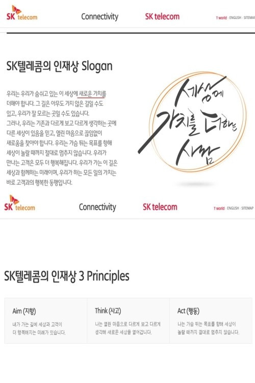 당연하지 않냐구요? B2C가 주된 수입원일 때 이런 말이 나옵니다. B2B 중심의 회사에는 이런 단어가 부각되어 있지 않습니다. 다시 얘기하면, SK텔레콤은 '고객 없으면 못살아' 무조건 고객이 우선입니다. 대부분의 B2C 중심 회사는 이 사실을 절대 잊으시면 안 됩니다. 고객의 니즈를 파악하고, 가치를 실현한다. 그럴 능력이 있다는 것을 무조건 어필하셔야 합니다.