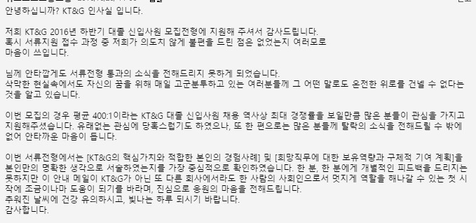'KT&G 인사팀 진짜 멋진 듯 ㅠㅠㅠㅠ' 뭐 이런 제목이었는데, KT&G에서 떨어진 어느 한 취준생이 인사팀의 불합격 문구를 보고 감동했다는 이야기였다. 많은 조회수와 댓글로 이 사람뿐만 아니라 많은 취준생들에게 위로가 되었음을 알았다.