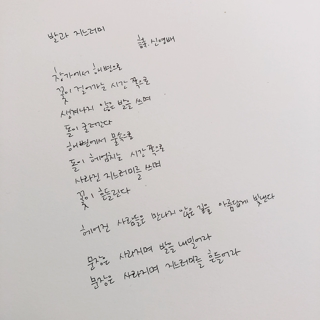 업무용 주니가 너무 불쌍해서 일상용 연주가 정성들여 펜을 들어 시를 옮겨 보았다. 문인들이란 본디 이렇게 화를 삭이고, 잉크에 스트레스를 꾹꾹 묻어 버리는 거 아닌가. 그럼에도 분이 가시지 않아 내일 것도 정성을 쏟아 보련다.