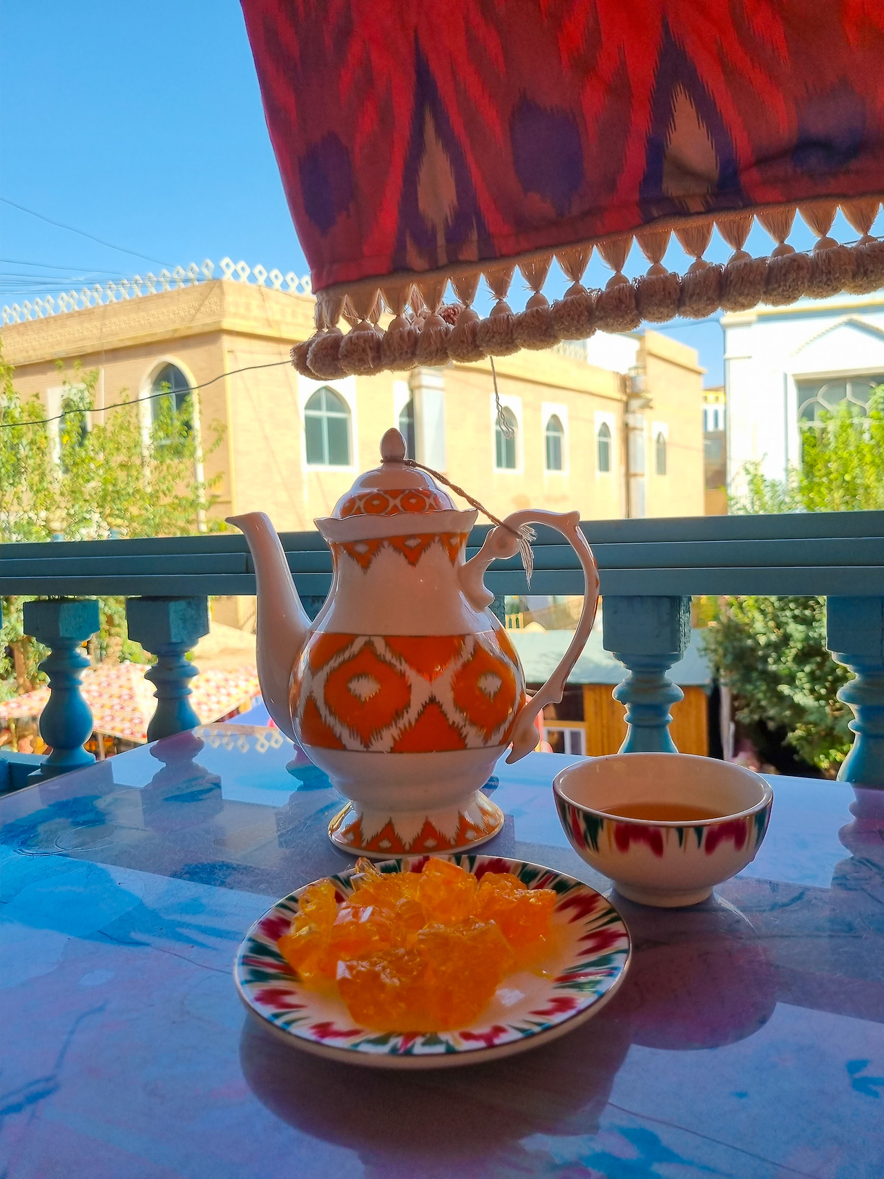 차를 주문하면 위구르 여인의 옷만큼 화려한 문양이 그려진 주전자에 가득 차가 담겨나온다. 큼직한 설탕결정체를 함께 주는데, 차를 마신 뒤 혀끝으로 녹여 먹으면 차의 씁쓸함이 달콤함으로 금새 바뀐다. 찻집 한켠에 악기가 놓여있고, 백발이 성성한 할아버지들이 모여있다가 수시로 공연을 보여준다. 보통 한 남성이 선창을 하고 뒤 이어 다양한 악기들이 보조를 맞춘다. 신장자치구 지역을 여행하면 위구르 음악을 자주 듣게 되는데, 위구르인들의 역사를 닮은 듯 구슬프고 애닯을 때가 많아 나도 모르게 눈시울을 붉힐 때도 있었다.