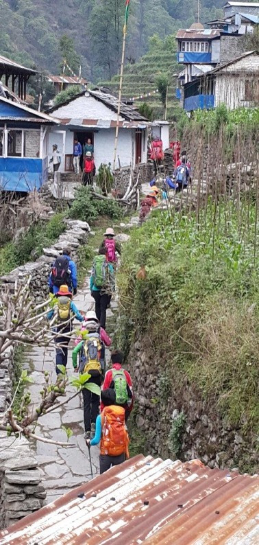 롯지는 늘 적당한 위치에 있지만, 다들 좋은 곳,나름 특색 있는 곳에 있는데, 이름도 재미있고, 때로 특색있는 View(전망) 주장이 웃음을 자아내기도 한다. 고라파니는 “말 물 먹이는 곳” 촘롱은 “모퉁이 마을” 구루중은 “구름 마을” 도반은 “두 물머리” 데우랄리는 “언덕 너머 가는 길” 등등의 뜻이란다. 촘롱의 캐치프레이즈는 “Heaven View” 반단티는 “Super View” 또 다른 곳은 “파노라마 뷰 등등이다. 촘롱 까지의 롯지는 그 지역 사람만이 할 수 있고, 더 높은 곳은 국가에서 관리 한다는 이야기를 들었다. 히말라야 롯지 부터는 “신의 영역”이어서 물소, 닭등의 동물이나 그 고기를 갖고 들어가면 안 된다는 표지판이 서 있었다. 나는 배낭에 소고기 육포가 들어 있었는데, 줄곧 꺼내거나 먹지 않았다.