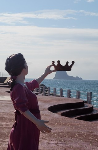 사자바위에 왕관을 씌워줄 빨강공주가 서 있습니다. 바위섬이 된 사자는 공주가 왕관을 씌워주면