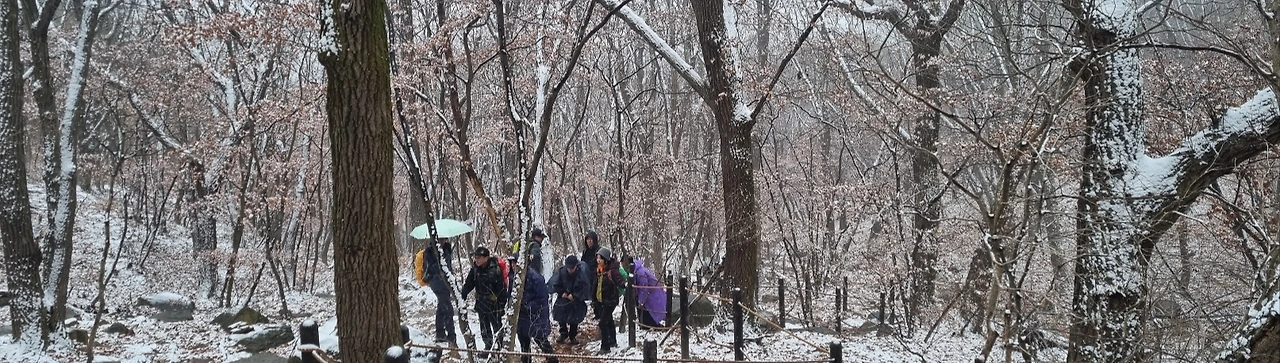 산 중턱을 오르니 흰 눈이 펑펑 내려 하얀 세상이 만들어지고, 축복받는 산행의 맛이 더욱 깊어진다.