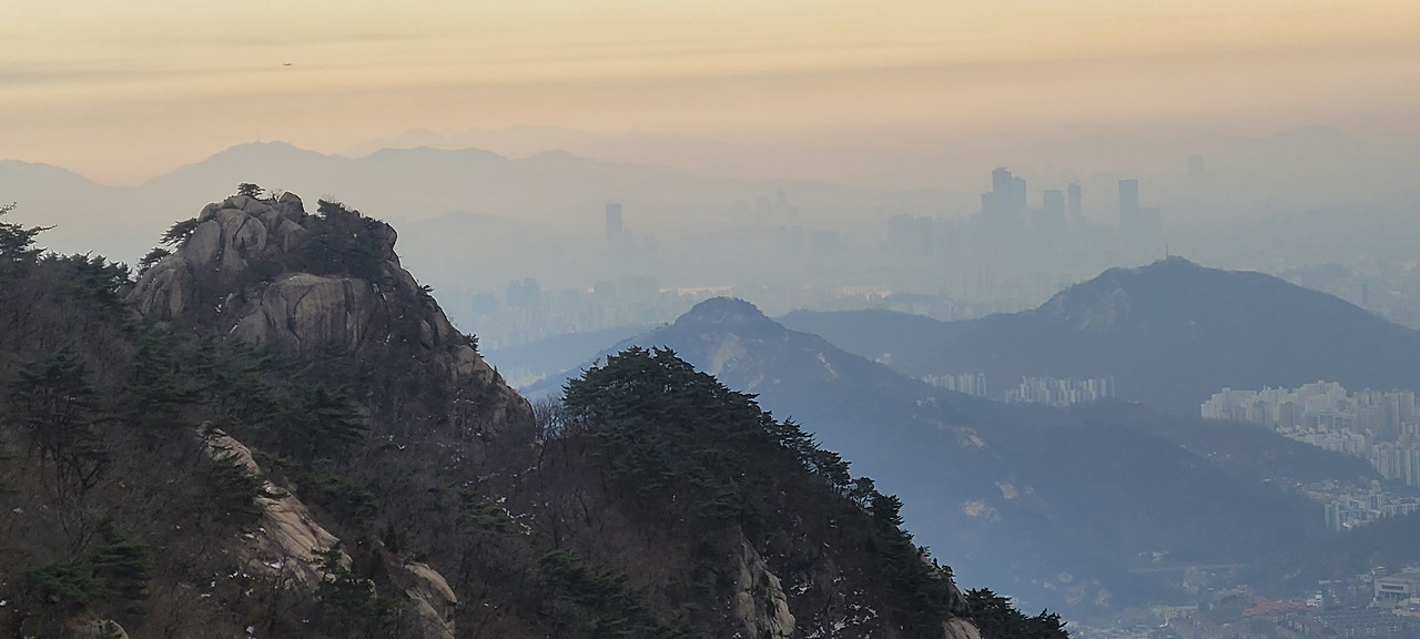 가까이 보현봉, 저 아래 북악산과 인왕산 그리고 안개 뒤 도심고층빌딩의 실루엣이 꿈길처럼 보인다.