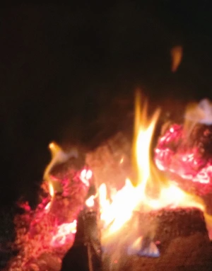 홀짝이며, 장작불을 보고 있다.