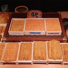 병에 담긴 우니부터 다양한 목곽우니들 그리고 안에 깜찍하게 데코를 한 우니도 있고- 확실히 일본은 우니의 천국이다. 성게알은 일본 3대 진미 중 하나이다. 간단히 3대 진미에 대해서 설명하면 가라스미(숭어알, 우리나라에서는 어란), 고노와다(해삼내장) 그리고 성게알이다. 확실히 온도에 민감해서 유통이 어려운 상품들이라 냉장시설이 갖춰져있지 않은 옛날에는 더더욱이나 진미로 불릴 수 밖에 없었을 것 같다.