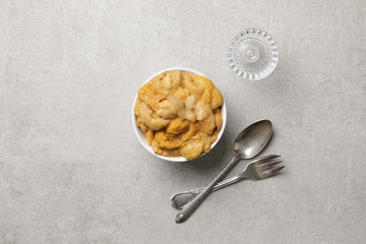 오늘회에서 작년에 통영 파트너사에 제조가공을 요청드려 만든 해수우니. 해수에 담겼지만 그래도 성게알 형태가 확실히 뭉개져있다.