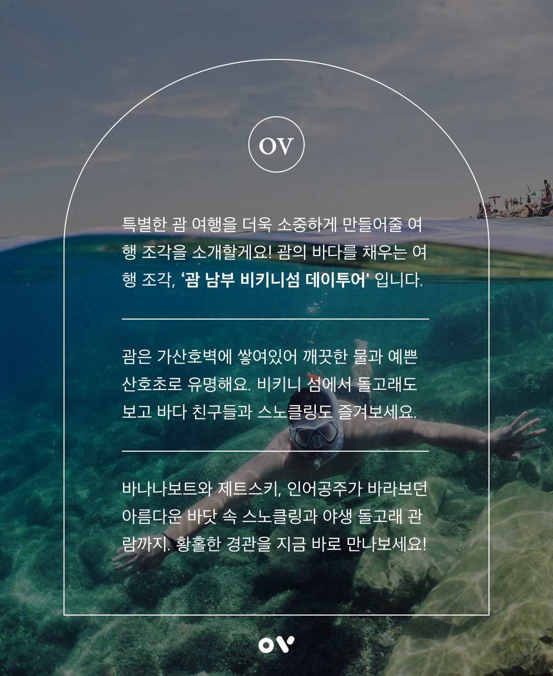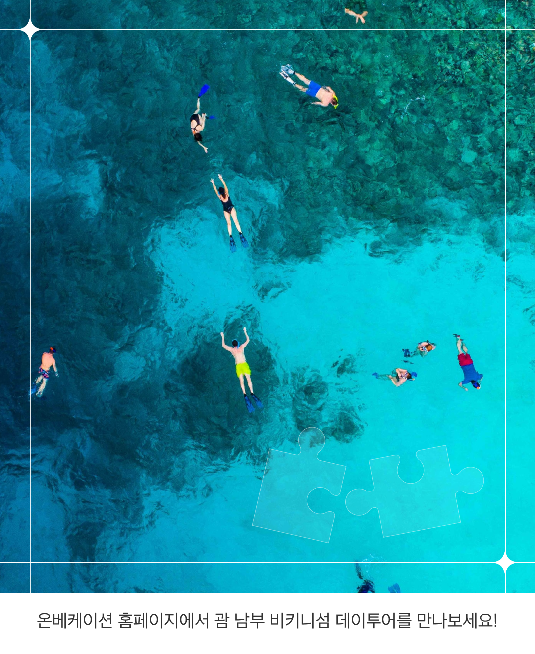 특별한 괌 여행을 더욱 소중하게 만들어줄 여행 조각을 소개할게요! 괌의 바다를 채우는 여행 조각, ‘괌 남부 비키니섬 데이투어' 입니다.