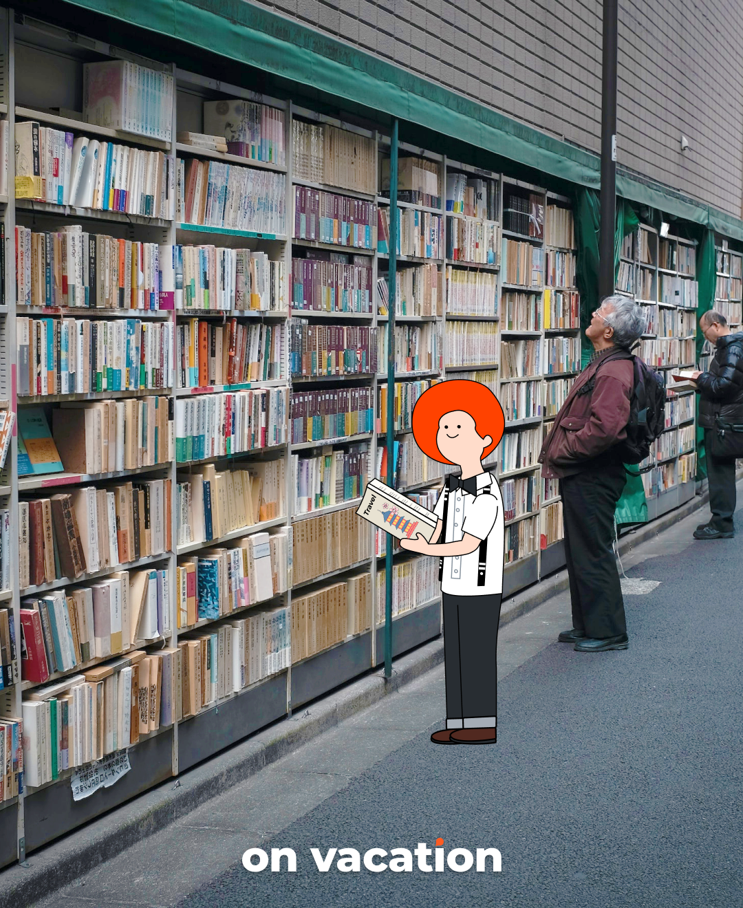 테일러는 일본 도쿄 진보초 고서점 거리에서 마음의 양식을 쌓고 있어요.