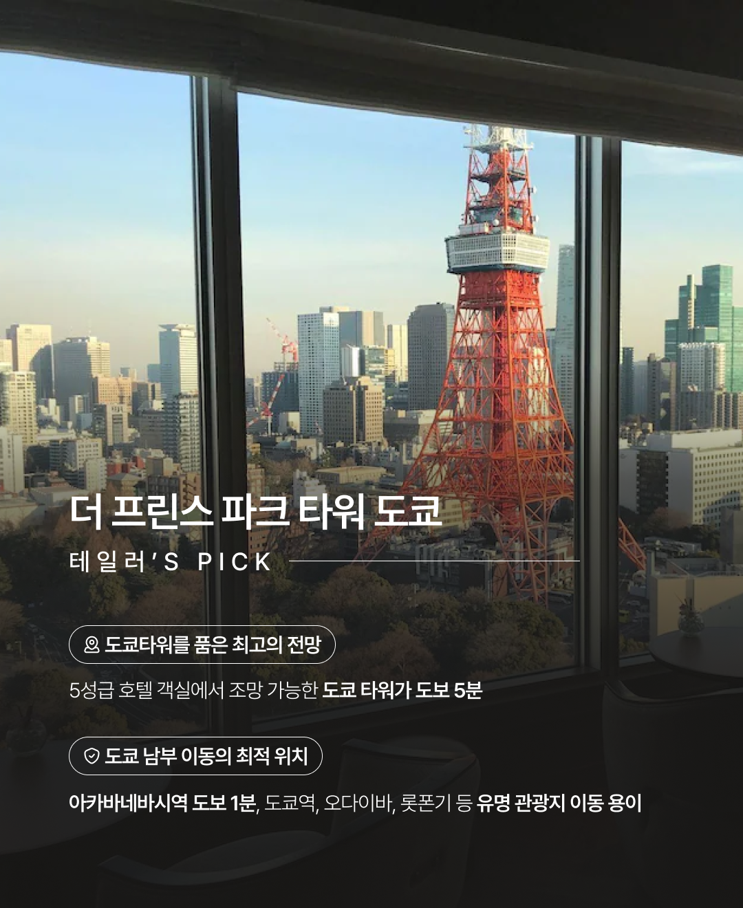 - 5성급 호텔 객실에서 조망 가능한 도쿄 타워가 도보 5분
