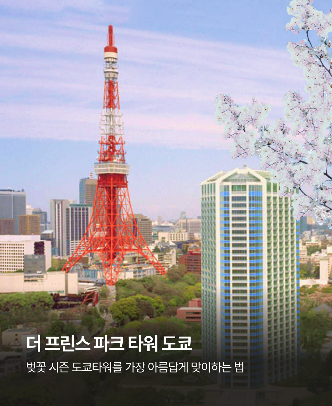 낮에는 분홍빛 벚꽃과 함께 멋진 도쿄타워를,