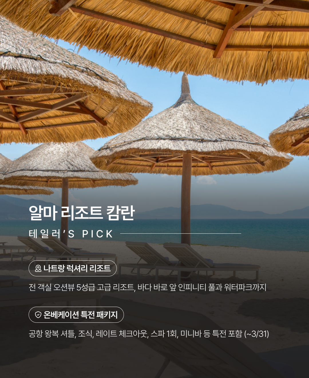 OV 테일러와 알마 리조트 캄란을 예약하고, 나만의 맞춤 베트남 나트랑 여행도 만들어보세요!