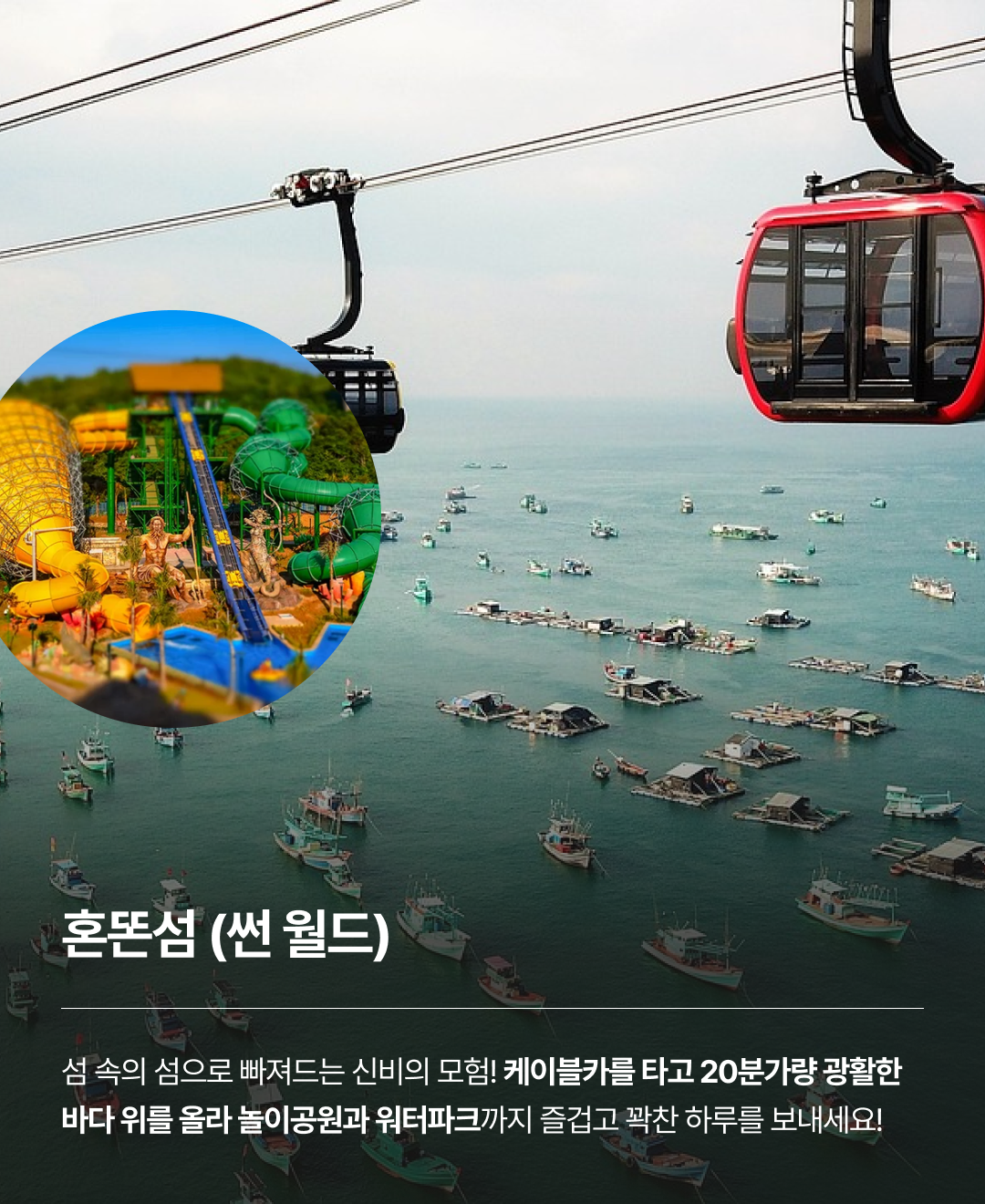 케이블카를 타고 20분가량 광활한 바다 위를 올라 놀이공원과 워터파크까지 즐겁고 꽉찬 하루를 보내세요!