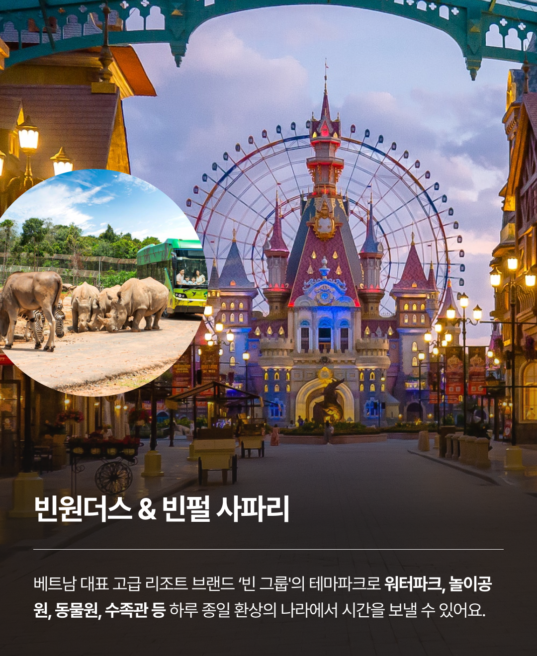 베트남 대표 고급 리조트 브랜드 ‘빈 그룹'의 테마파크로 워터파크, 놀이공원, 동물원, 수족관 등 하루 종일 환상의 나라에서 시간을 보낼 수 있어요.